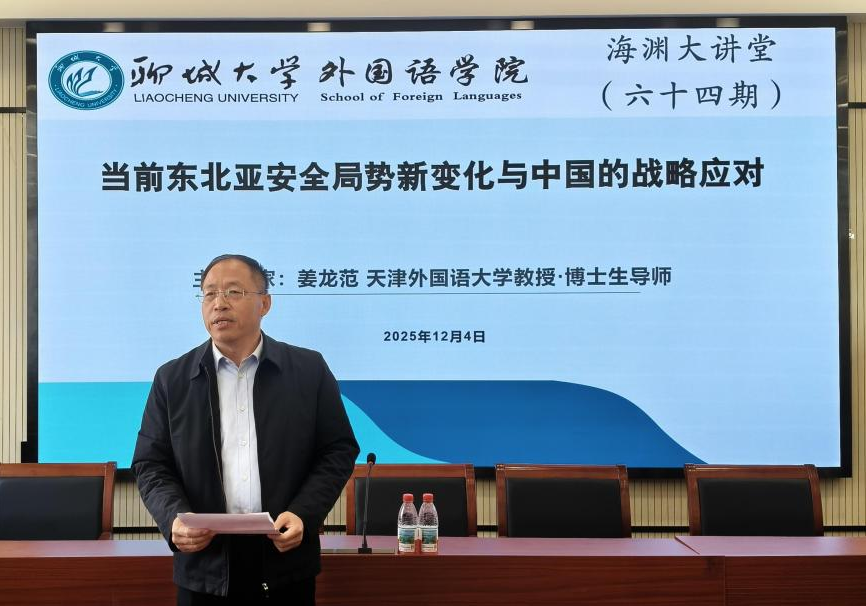 为深入贯彻落实党的二十届四中全会精神,推动高校有组织科研与高质量人才培养协同发展,12月4日,聊城大学外国语学院、大学外语教育学院在西1#C405举办“当前东北亚安全局势新变化与中国的战略应对”专题讲座并同期召开2026年度国家社会科学基金项目论证会。活动特邀天津外国语大学国别和区域研究院院长、博士生导师姜龙范教授担任主讲与论证专家。此次活动由外国语学院院长李维滨主持,外国语学院副院长刘宾和学院相关教师出席,2025级研究生参加。