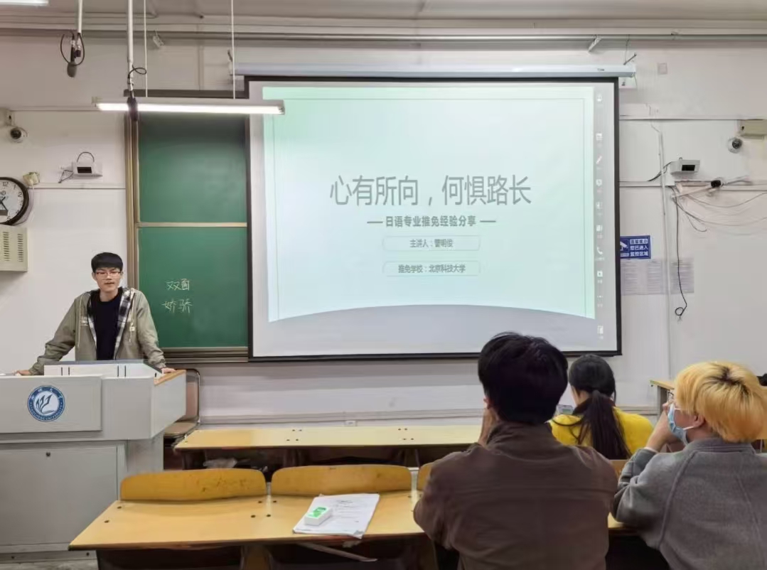 李田阁将备考准备作为此次分享的重点内容,从文书准备、笔试准备、面试准备三个方面分别进行阐述。他以在校期间丰富的实践活动和竞赛经验为引,鼓励学生们积极参与列入竞赛目录的赛事,提高自身的竞争力,为推免文书提供材料,为职业发展积累经验。李田阁还强调自我锻炼的重要性,鼓励学生们在课余时间进行新闻朗读、录音复盘等方式强化训练,并尝试在公共场合进行日语演讲,为面试全程日语问答做准备。