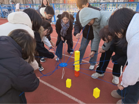 活动以协作为主线,设计了四大互动环节。在“大风车”游戏中,学生手拉手围成圆圈,根据指令快速变换位置,通过肢体接触与眼神交流拉近彼此距离;“滚雪球”报家乡名称环节中,每位学生复述前一人的信息并自我介绍,学生们在笑声中迅速熟络;“手拉手传呼啦圈”要求团队不松手完成呼啦圈传递,考验灵活配合,学生们保持双手紧握的状态,尝试以身体的转动传递呼啦圈,过程中既有因节奏错位导致的“卡壳”,也有通过眼神示意、轻声提醒实现的流畅衔接,团队默契在互动中持续升温;最后的“团体搭积木”任务里,各小组分工执行任务,共同用绳子勾起积木,并将所有积木叠放在一起,团队间互相配合激发热情斗志,在沟通中学会了协作。
