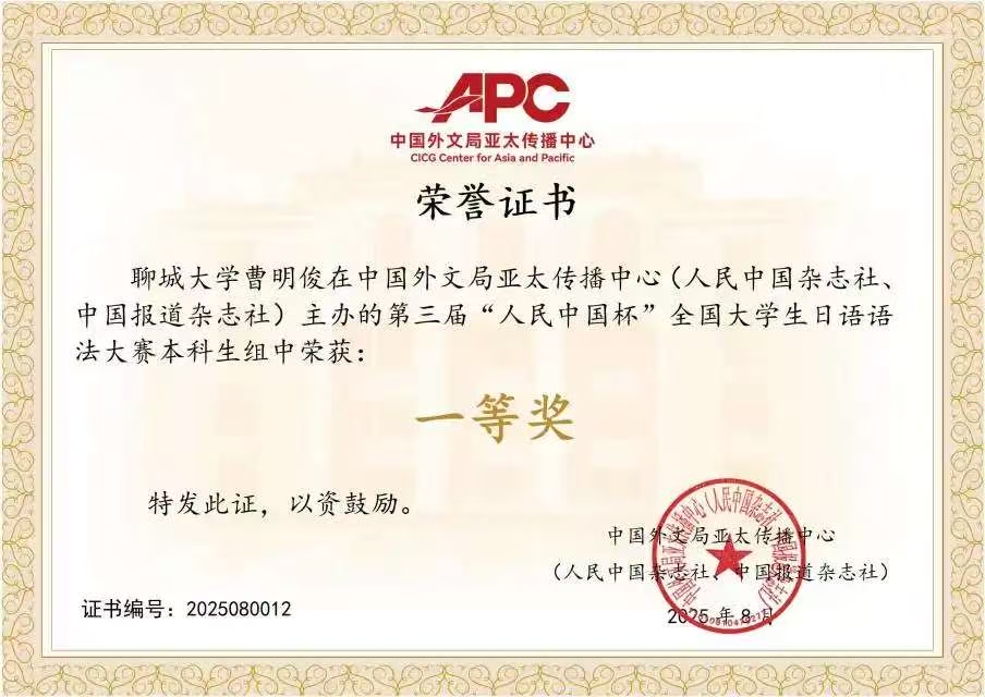 外国语学院曹明俊在第三届“人民中国杯”全国大学生日语语法大赛中积极参与,取得优异成绩,荣获一等奖。该同学品学兼优,积极进取,热烈祝贺!