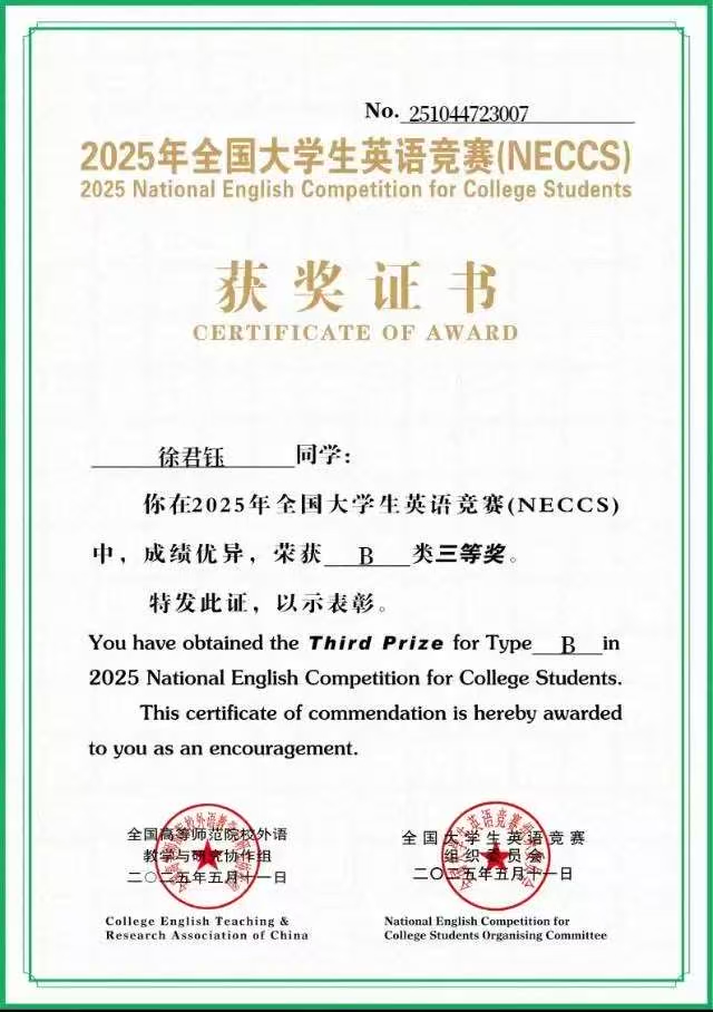 » 外国语学院徐君钰2025年全国大学生英语竞赛三等奖