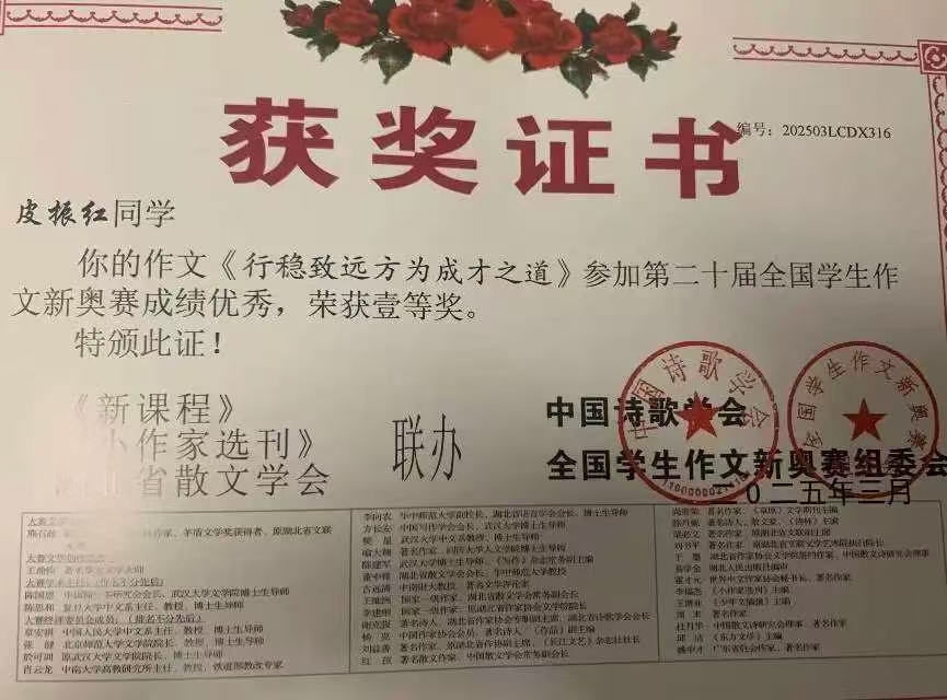 外国语学院皮振红第二十届全国学生作文新奥赛一等奖