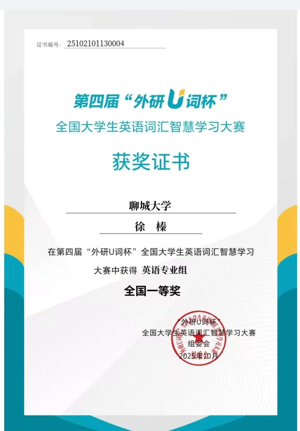 外国语学院徐榛全国大学生英语词汇智慧学习大赛专业组全国一等奖