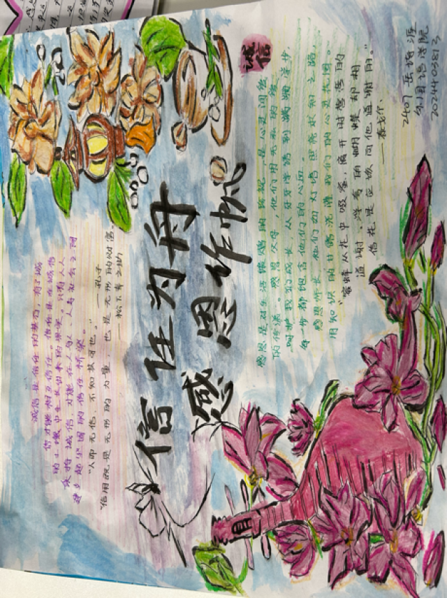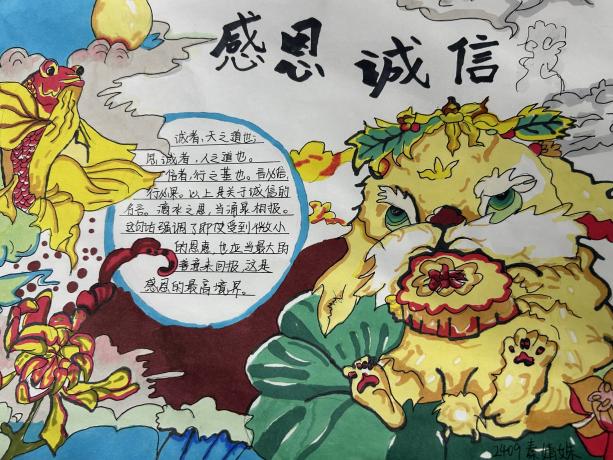 活动开始后,学生们热情高涨,纷纷投入创作,围绕主题广泛搜集资料、深入思考诚信与感恩的内涵、精心构思版面、巧妙调配色彩。手抄报作品或以诚信故事为引,穿插名言警句,传递诚实守信的重要性;或将感恩父母、老师、社会的情感融入图文,展现生活中的温暖点滴;或以传统美德为引,穿插名人轶事与经典诗词,传递千年文化的深厚内涵。色彩斑斓的图画、工整隽秀的文字、别出心裁的排版,每幅作品都凝聚着学生的创意与用心,成为美德教育的生动载体,形成了一场独具特色的“美德视觉盛宴”。获奖作品在外国语学院大厅展出,吸引众多学生驻足欣赏。一幅幅精美的手抄报,不仅成为了外国语学院一道亮丽的风景线,更在潜移默化中引导着学生树立诚信意识、培养感恩之心,让美德内化于心、外化于行。