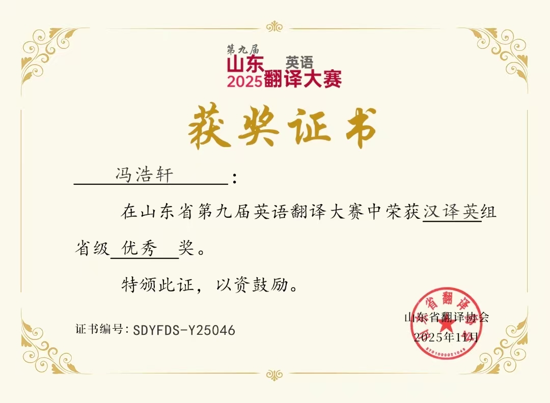 冯浩轩在山东省第九届英语翻译大赛中荣获汉译英组省级优秀奖