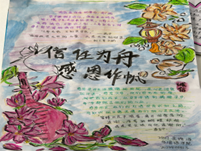 活动开始后,学生们热情高涨,纷纷投入创作,围绕主题广泛搜集资料、深入思考诚信与感恩的内涵、精心构思版面、巧妙调配色彩。手抄报作品或以诚信故事为引,穿插名言警句,传递诚实守信的重要性;或将感恩父母、老师、社会的情感融入图文,展现生活中的温暖点滴;或以传统美德为引,穿插名人轶事与经典诗词,传递千年文化的深厚内涵。色彩斑斓的图画、工整隽秀的文字、别出心裁的排版,每幅作品都凝聚着学生的创意与用心,成为美德教育的生动载体,形成了一场独具特色的“美德视觉盛宴”。获奖作品在外国语学院大厅展出,吸引众多学生驻足欣赏。一幅幅精美的手抄报,不仅成为了外国语学院一道亮丽的风景线,更在潜移默化中引导着学生树立诚信意识、培养感恩之心,让美德内化于心、外化于行。