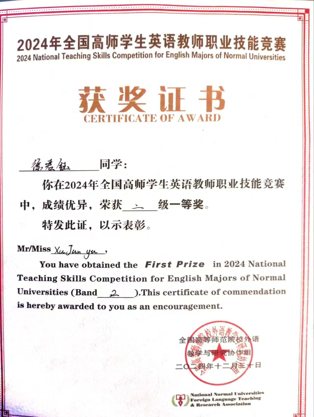 » 徐君钰在2024年全国高师学生英语教师职业技能竞赛中获得二级一等奖