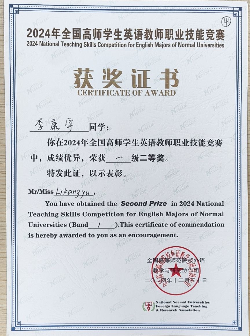 李康与在2024年全国高师学生英语教师职业技能竞赛获得一级二等奖