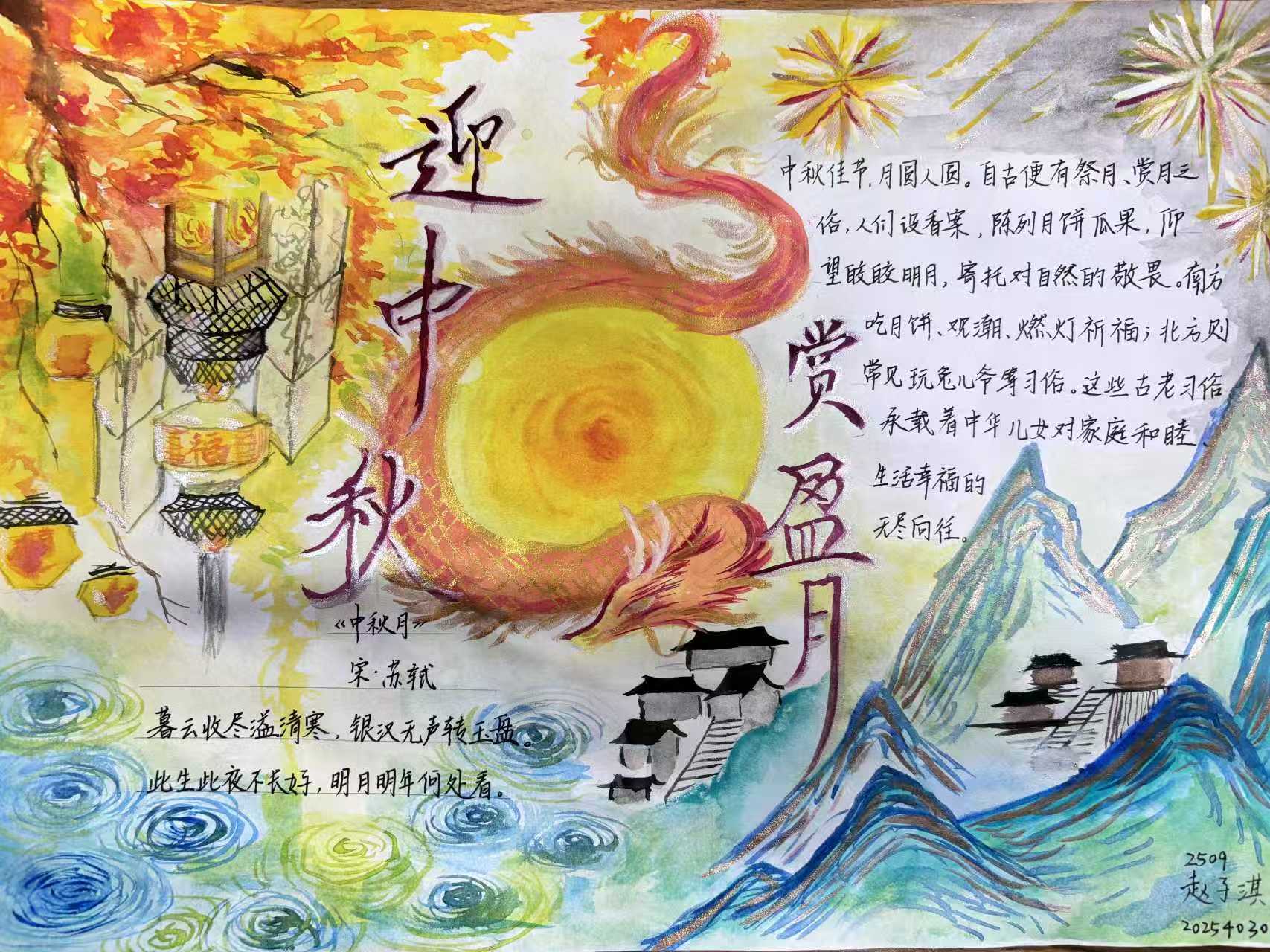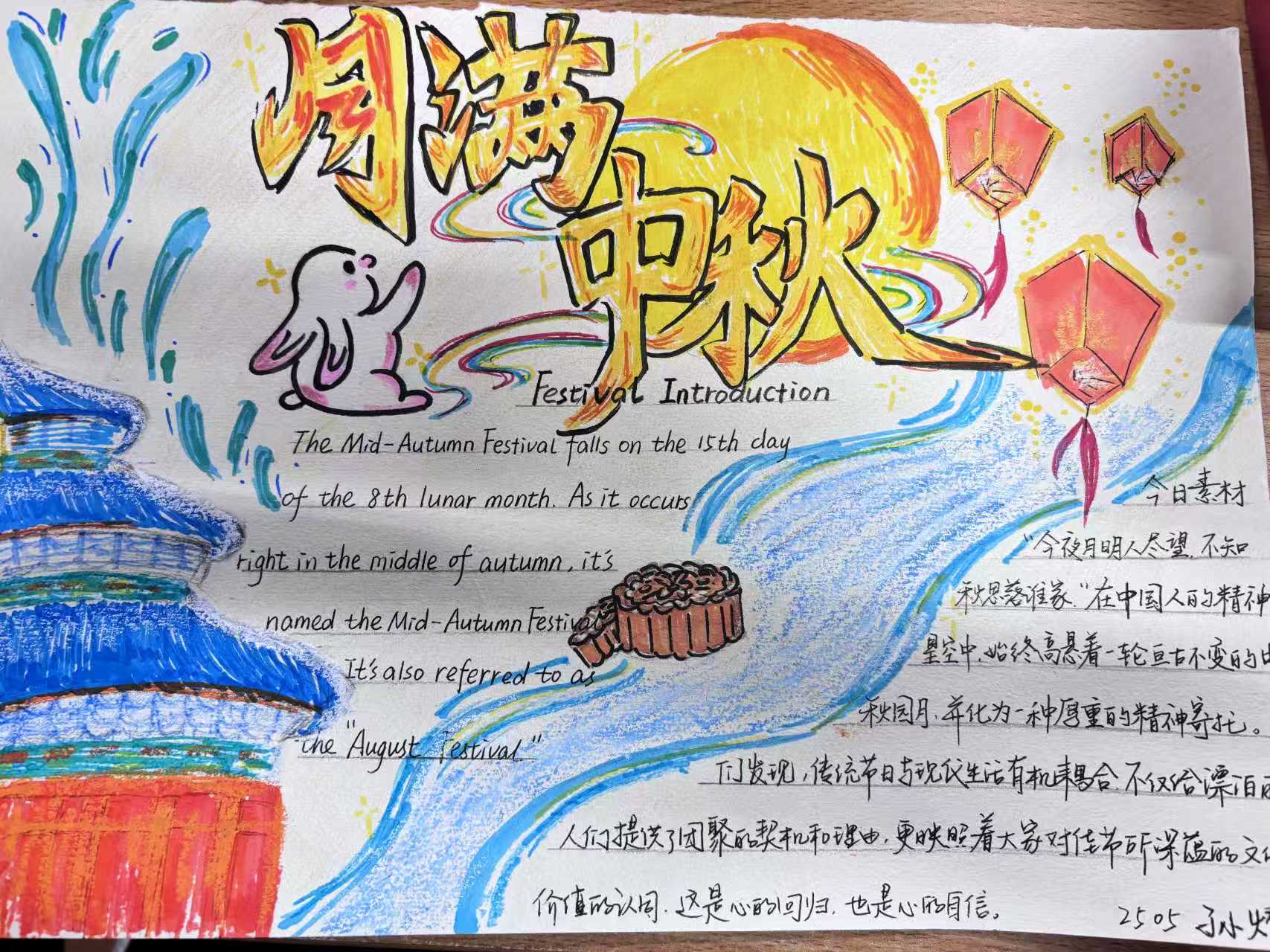 本次活动以手抄报为艺术载体,成功引导学生在创作过程中主动探索和传承中秋文化,有效增强了青年一代对传统节日的认同感与归属感,对弘扬优秀传统文化、坚定文化自信起到了积极的推动作用。