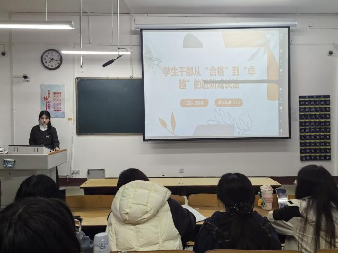 为提升学生干部的综合素质与工作能力,强化其责任意识与服务精神,打造高效团结的干部队伍,助力学院学生工作有序开展与长远发展,10月23日,外国语学院于西1#A516开展了主题为“从‘合格’到‘卓越’:学生干部的进阶成长法”学生干部培训会。本次会议由22级优秀学生田露凝担任主讲人,各学生干部积极参与。