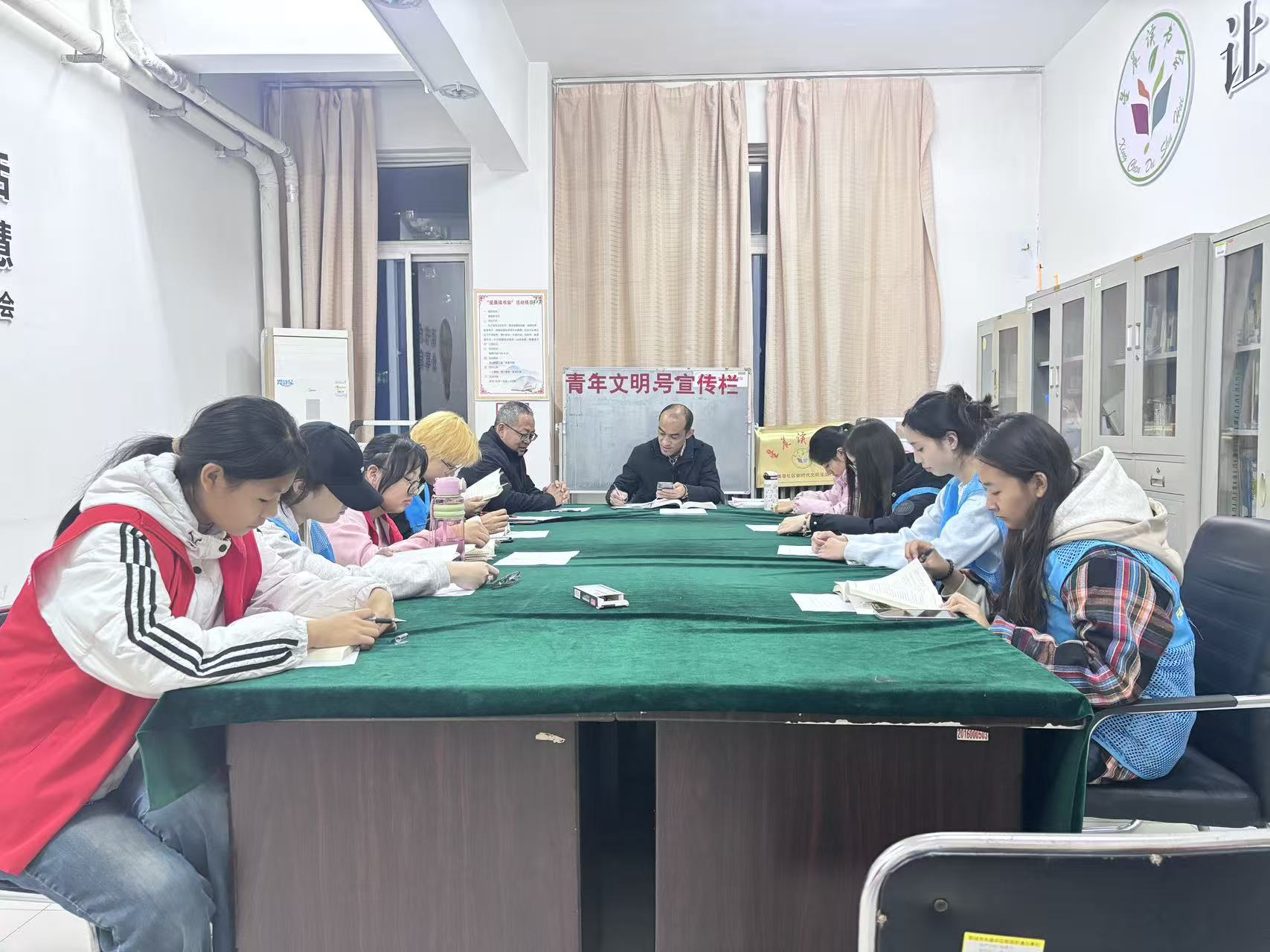 红旗巷社区活动中心内,外国语学院志愿者统一着装,以饱满的精神状态投入服务工作。他们精心布置阅读空间,营造安静有序的读书环境,并依托专业背景为社区居民系统导读多部经典作品,引导大家深入理解文本内涵。