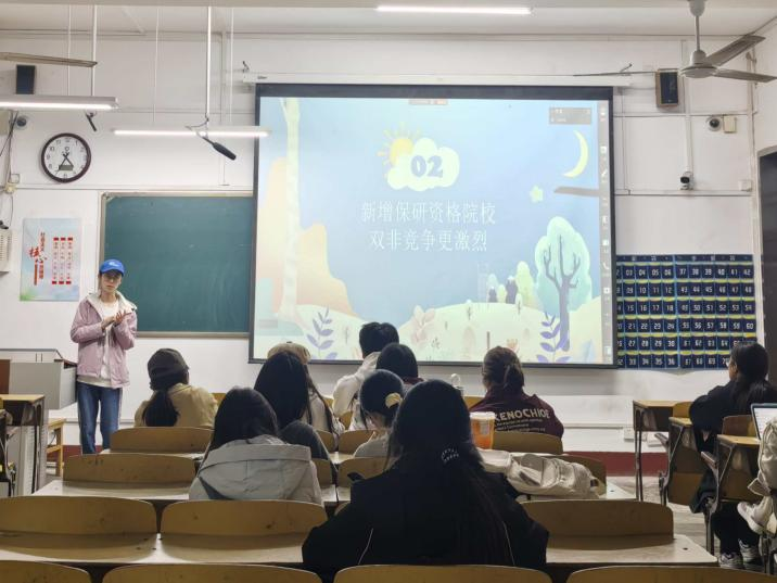 孙萌将此次讲座分为“政策与规则解读”“核心能力提升经验分享”“升学关键环节指导”和“互动交流环节”四个部分。首先,她结合自身学习经验,向学生们解读相关的保研政策与规则,以个人经历,详细阐述了担任学生会干部时期的工作心得,强调了学业与任务之间平衡的重要性。此外,他还分享了如何在压力中坚定保研目标,达成学术成就,不断完善自我的方法。