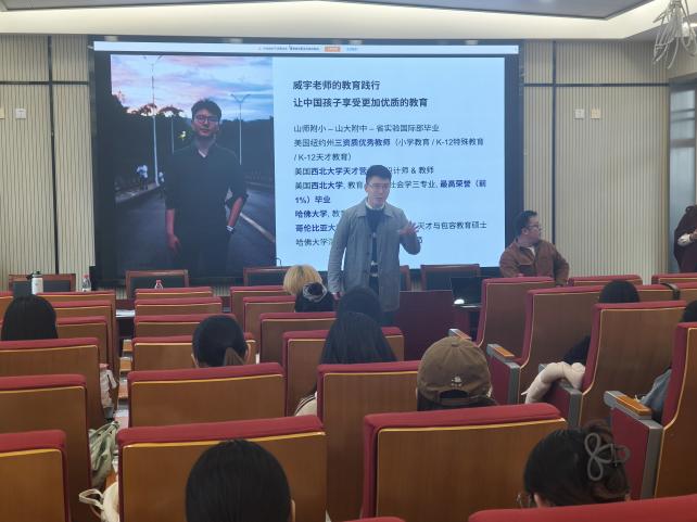 宣讲会伊始,山东原始人信息技术有限公司济南分公司校长介绍了企业相关信息。宣讲中,持美国纽约州三项教育资质的教师威宇,结合个人求学及海外教学实践经历,系统阐述公司在教育资源整合、个性化教学等方面的优势,彰显企业对高水平教育团队的战略投入,助力学子深入了解企业。