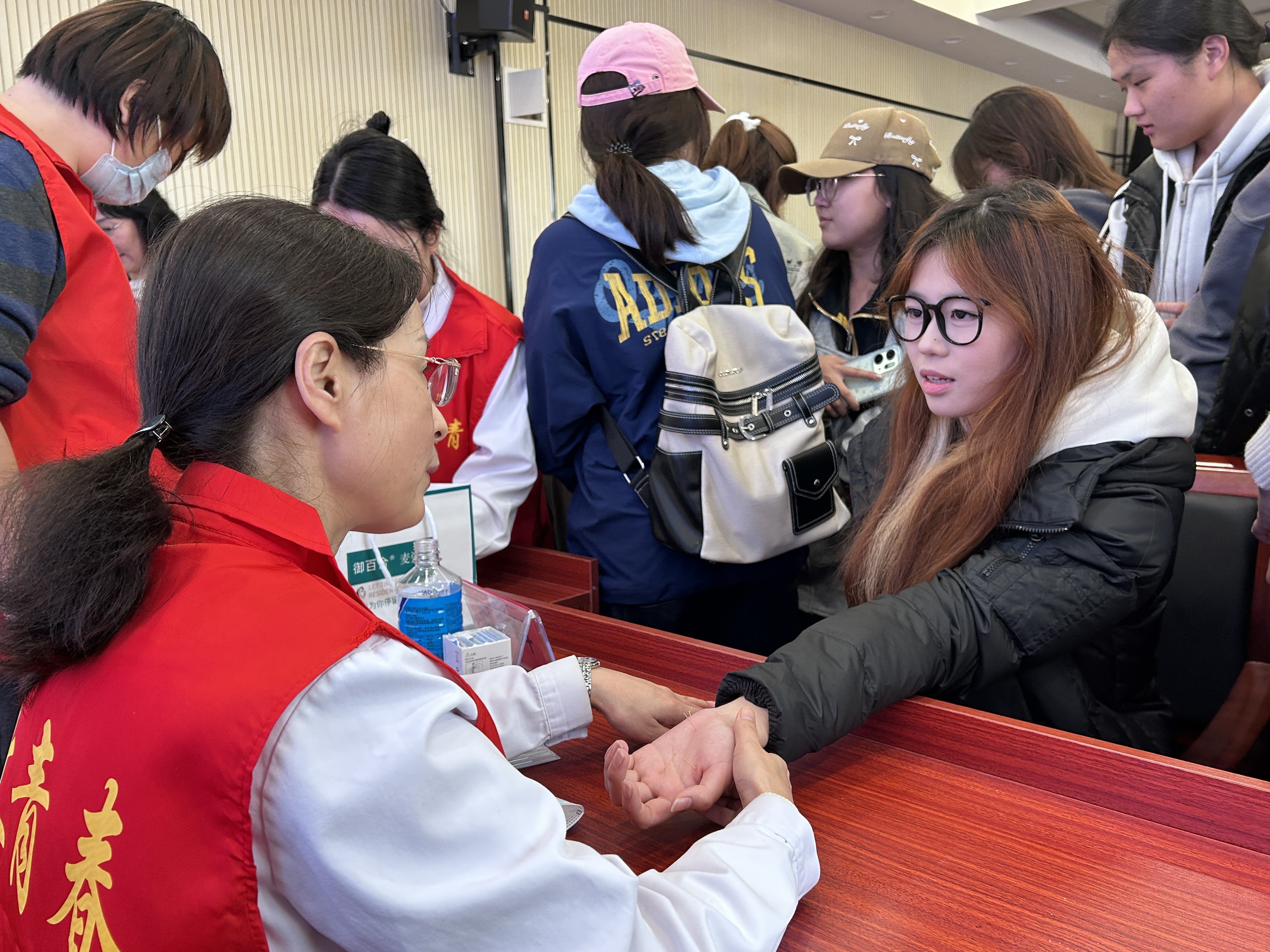 最后的交流互动环节将气氛推向高潮。专家们为学生们把脉问诊,一对一解答关于美容护肤、月经不调等个性化问题。女学生积极提问,专家们耐心倾听、悉心指导,现场氛围热烈而融洽。