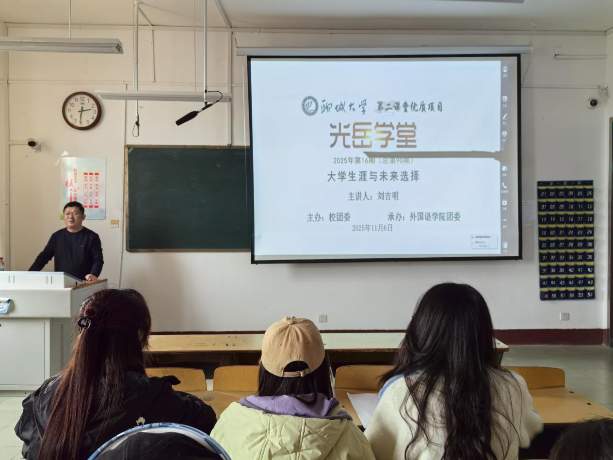 为赋能学生职业规划,提升核心竞争力,11月6日,外国语学院于西1#A512举办“光岳学堂——大学生涯与未来选择”主题活动。本次讲座特邀刘吉明老师担任主讲,外国语学院学生积极参与。