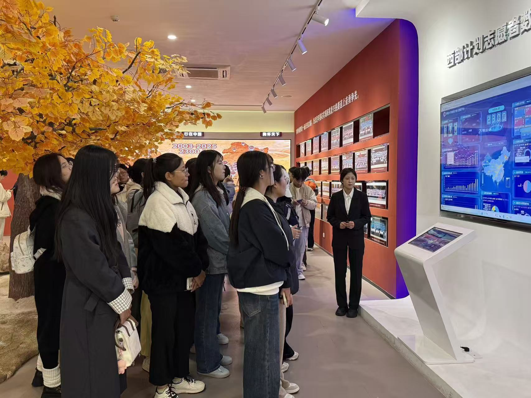 随后,队伍移步至西部计划展馆。展馆内各单元紧密相连、逻辑清晰,生动展示了西部计划的精神内涵与光辉成就。志愿者们“到西部去、到基层去、到祖国和人民最需要的地方去”的动人故事,让学生们深切感受到了服务国家战略、投身基层建设的深远意义。同学们认真参观、仔细记录,被一代代青年榜样的奉献精神深深鼓舞,立志在未来的学习与生活中汲取榜样力量,勇担时代使命,砥砺前行。