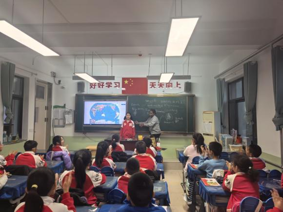为深化高校与基础教育协同育人机制,推进外语教学资源常态化共享,聊城大学外国语学院持续开展外教进附小系列活动。近日,学院外籍教师Georgina第四次走进聊城大学附属小学,以“快乐英语,世界之旅”为主题开展跨文化英语实践活动,标志着此项合作已形成常态化机制,为附小英语教育注入持续动力。本次活动以沉浸式、互动式教学为路径,有效拓展了小学生的国际文化视野,激发了外语学习内生动力,是高校智力资源辐射带动基础教育发展的生动体现。