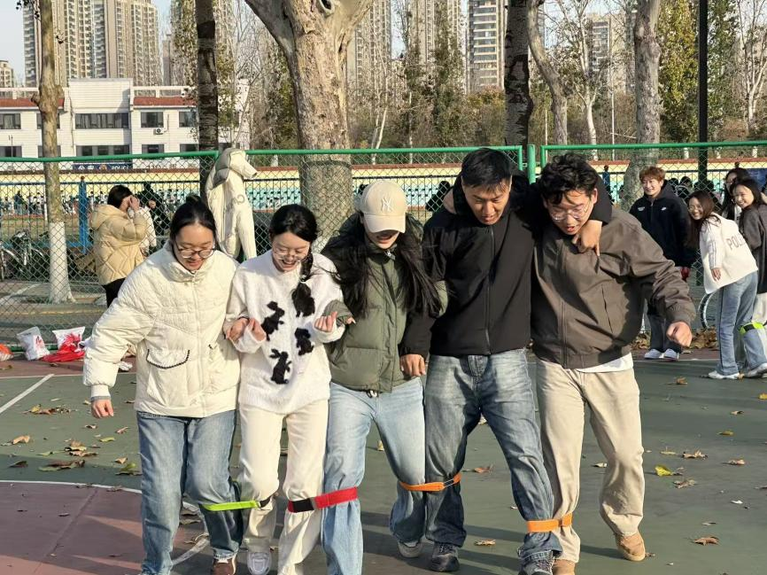 当严谨细致的研究生们走出学术殿堂,活动现场瞬间被他们活力满满的身影所点燃。在“乒乓夹夹乐”环节,小小的乒乓球在同学们的筷子间稳健传递,外语学院同学的沉静耐心与计算机学院同学的理性分析碰撞融合,大家各显所长,当感性灵动与理性严谨交织,每一次传递都似学科思维的精彩接力,赢得现场阵阵关注。在“绳彩飞扬大挑战”环节,长绳扬起优美弧线,队员们看准时机鱼贯而入,起跳、落地一气呵成。摇绳者稳如磐石,跳绳者轻如飞燕,每一次成功计数都引发队友欢呼,个人节奏在团队韵律中交融,大家为共同目标同心同力。在“六人七足”环节,响亮的口号回荡在篮球场上,同学们肩并肩、步同步,每一次前行都是对信任与配合的生动演绎。有的队伍步履如飞,有的队伍中途调整,却无一支队伍放弃,所有人的心中都锚定着同一个目标——携手冲过终点线,在齐心同力间尽显科研人特有的默契与担当。