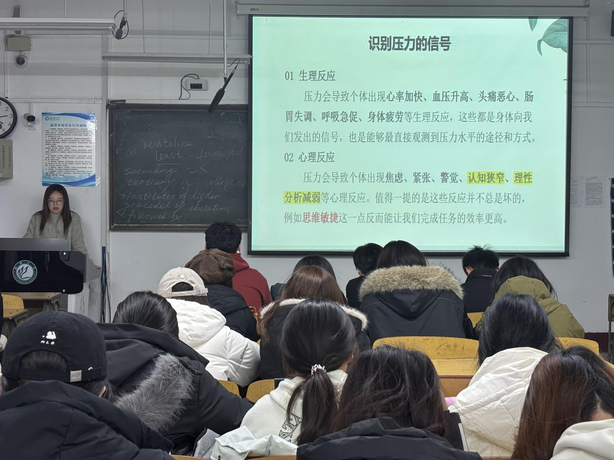 为切实缓解学生学业压力,提升心理调适能力,引导学生以积极心态应对学习挑战,12月9日,外国语学院于西1#A304教室成功举办“与压力和解,为学习松绑”阳光大讲堂活动。本次活动特邀校心理健康教育与咨询中心研究生助理李婧担任主讲人,25级学生积极参与。
