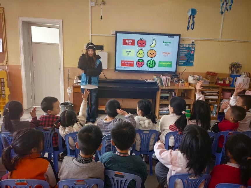 游戏互动阶段,志愿者用文字提示与特征描述引导幼儿猜果蔬,还以“What am I?”的句式开展蔬菜猜谜,小朋友们积极举手、大胆作答,课堂氛围十分活跃。活动尾声,学生播放《Vegetable song》动画视频,带领幼儿模仿胡萝卜、西兰花的形态做肢体动作,在欢快的歌声中巩固所学知识,最后还为幼儿发放小奖品,鼓励幼儿多吃果蔬、持续探索英语乐趣。