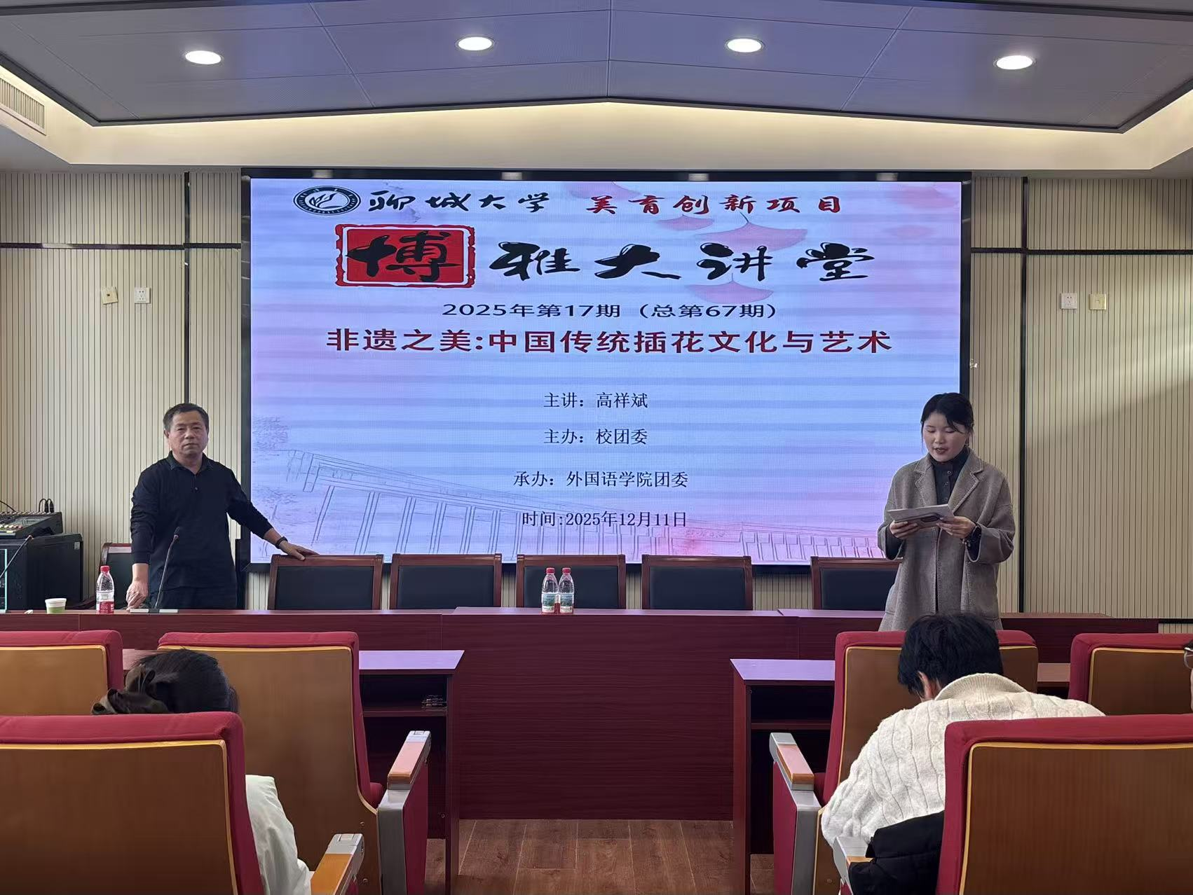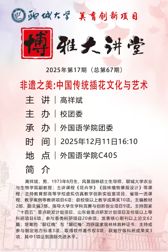 为深化学生对中国传统非遗文化的理解,涵养审美情趣与文化传承意识,12月11日,由校团委主办、外国语学院团委承办的2025年第十七期博雅大讲堂于外国语学院西1#C405教室举行。本次活动由外国语学院辅导员王萌老师主持,特邀农业与生物学院副教授高祥斌老师担任主讲人。