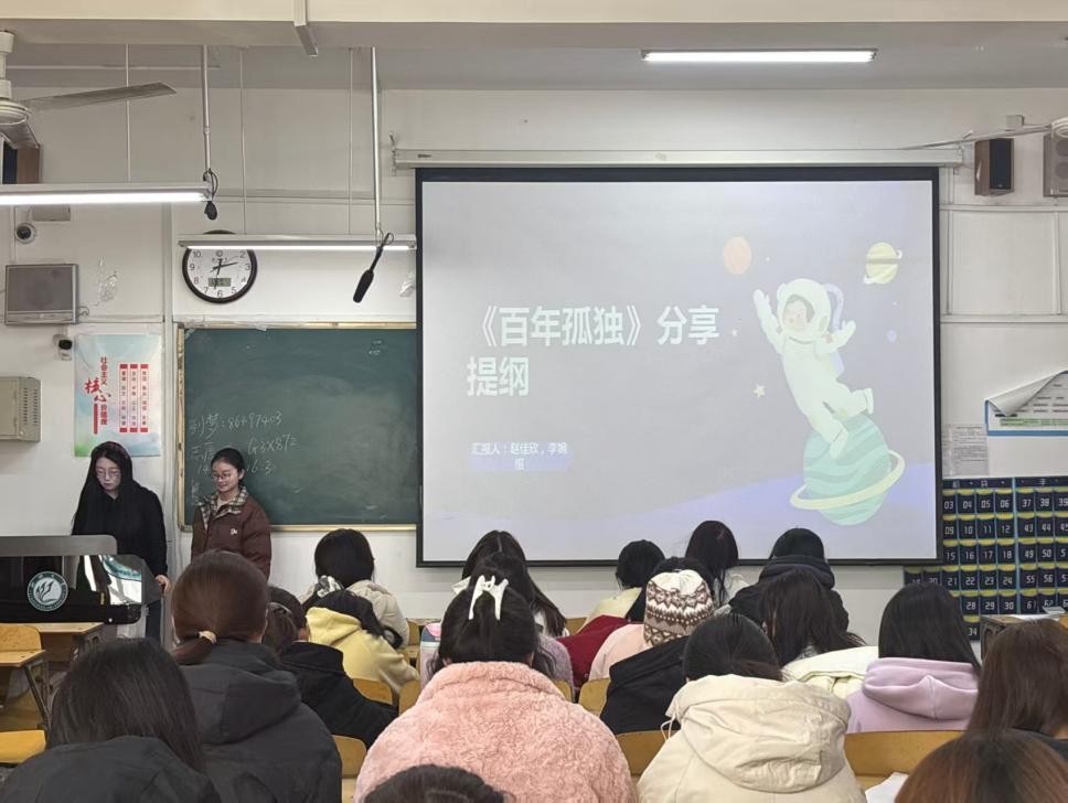 活动伊始,赵佳欣和李婉榕围绕《百年孤独》展开分享,从书中魔幻现实主义的叙事手法、家族命运的轮回脉络出发,结合自身阅读感悟,剖析了作品中蕴含的拉美文化内核与人性思考,让在场学生对拉美文学与文化有了更深刻的理解。随后,刘天心、武可鑫、解雅茹、郄博涵、侯玉娇、王新云以小剧场的形式演绎《傲慢与偏见》经典片段,通过生动的台词与肢体表现,还原了伊丽莎白与达西之间的情感纠葛,将19世纪英国的社会风貌与婚恋观念展现得淋漓尽致,现场氛围十分热烈。活动最后,高艺函、李宇轩、李青华进行《小王子》的配音展示,用不同的声线诠释书中角色的情感,细腻的演绎让听众沉浸在小王子的奇幻旅程中,也让大家感受到了文学的浪漫与哲思,进一步拓宽了国际文化。