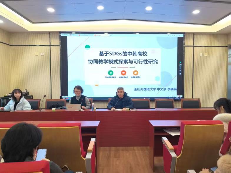 为探索基于SDGs的中韩高校协同教学模式、深化可持续发展教育校际交流,12月22日,中韩高校协同教学专题研讨活动于西1#C405顺利开展。釜山外国语大学中文系李晓英副教授担任主讲,校内众多学生到场聆听,现场交流氛围热烈。