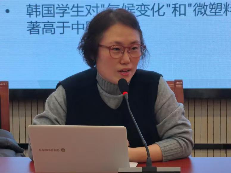 研讨中,李晓英副教授展示了韩国高校SDGs教育实践案例,延世大学、庆熙大学、汉阳大学通过设立专门机构、开设必修课程、引入产业-校园项目式学习等方式推进SDGs教育的经验,让在场学生对韩国高校的制度化建设思路有了清晰认知。同时,她介绍了Tandem语言伙伴模式实施细节,该模式通过中韩学生一对一自主学习、50:50语言交流原则,将SDGs融入跨文化教学,还结合垃圾分类、海平面上升等主题展示了具体教学实践。