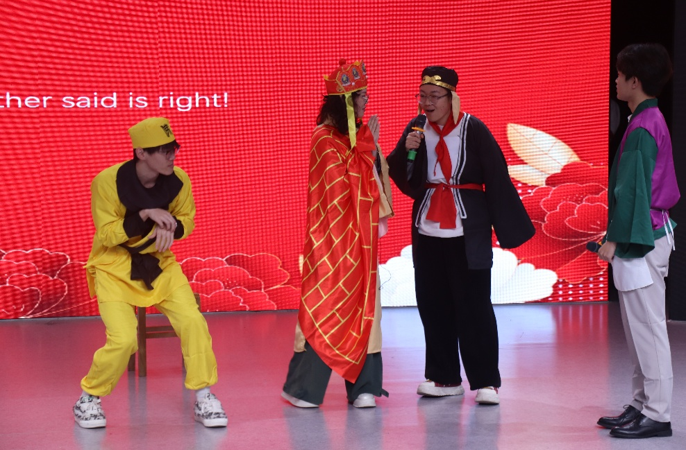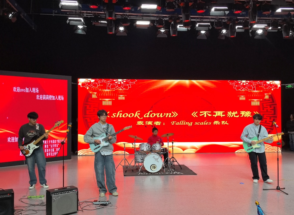 第一幕“青春正燃·岁喜新章”,是青春与文艺的碰撞,尽显外院学子的朝气与才情。Falling scales乐队带来的《不再犹豫》《shook down》,节奏铿锵,旋律燃动,瞬间点燃现场氛围;援疆志愿服务队的朗诵《援疆筑梦·同心同行》,字字铿锵,句句真挚,将援疆的初心与坚守深情诉说;《音乐漫游·歌曲串烧》汇聚多样曲风,悠扬轻快的歌声里,满是青春的浪漫与洒脱;“莎翁杯” 优秀代表队带来《八十一难之女儿国》,以创意改编融合经典与现代,台词与表演兼具趣味与深度,为舞台更添别样风采。而“方言大比拼”的暖场游戏更是点燃全场趣味,来自各地的学子用家乡话互相应和,台下笑声此起彼伏,让晚会处处洋溢着烟火气与亲切感。