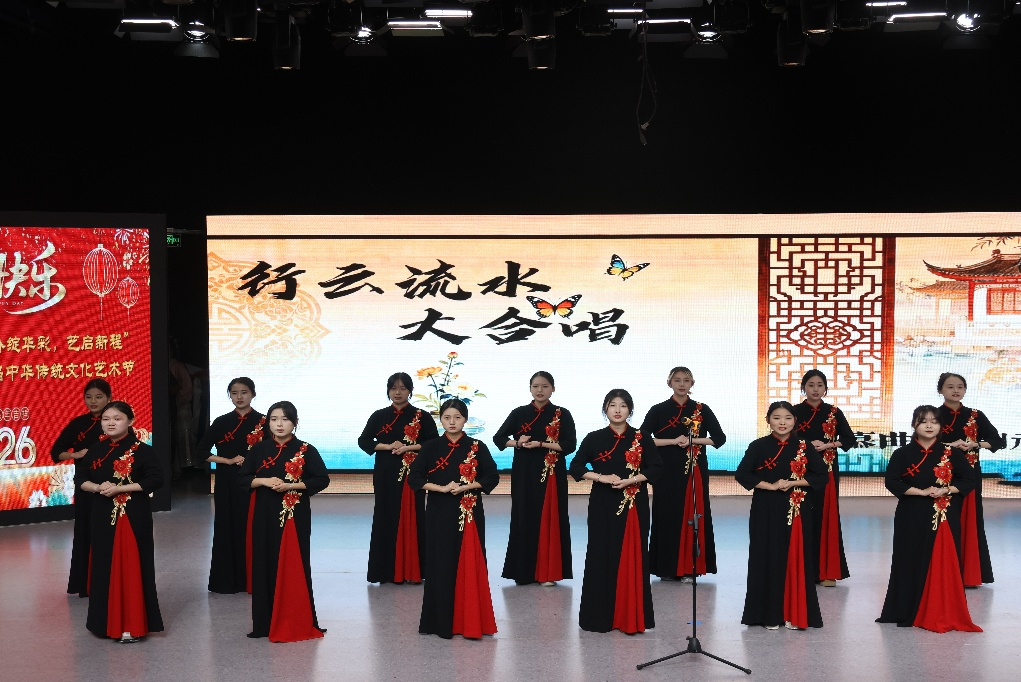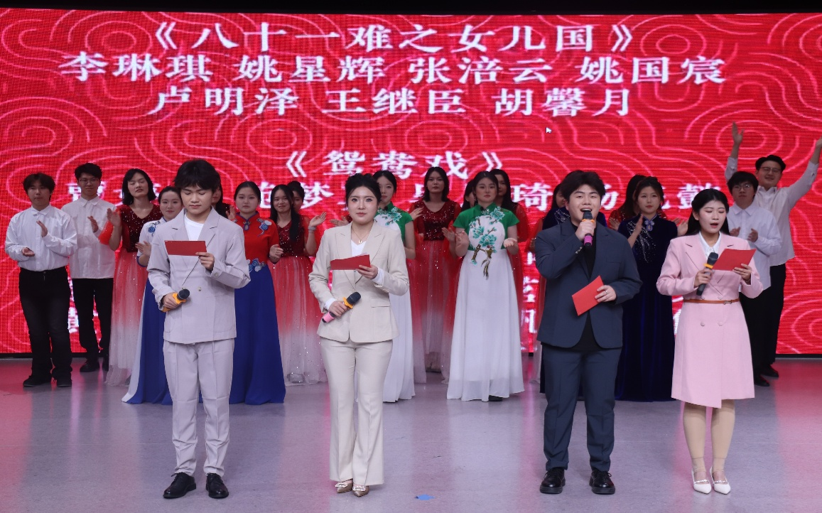 第二幕“古韵新声·喜乐雅集”将传统文化与舞台艺术深度融合,韵味悠长。贾婷文、苑梦真等同学演绎的《鸳鸯戏》,身段婉转、唱腔清甜,将古典戏曲的灵动俏皮展现得淋漓尽致;四位小朋友登台演绎《说唱脸谱》,稚嫩的歌声搭配韵味十足的戏曲念白,童真童趣的表演让现场瞬间充满温馨与欢乐;慕曲京剧社带来《行云流水大联唱》,串烧《苏三起解》《红灯记》《卖水》经典选段,京腔京韵字正腔圆,一招一式尽显京剧艺术的博大精深,让现场观众沉浸式感受国粹的独特魅力;淇奥汉服社的《华裳》表演中,学子们身着各式汉服款款而来,衣袂飘飘间勾勒出中华传统服饰的典雅之美;2023级汉教学生演绎的《白蛇传·亲儿的脸》选段情感饱满、催人动容;李祥雨带来的《红娘》选段唱腔甜润、念白伶。