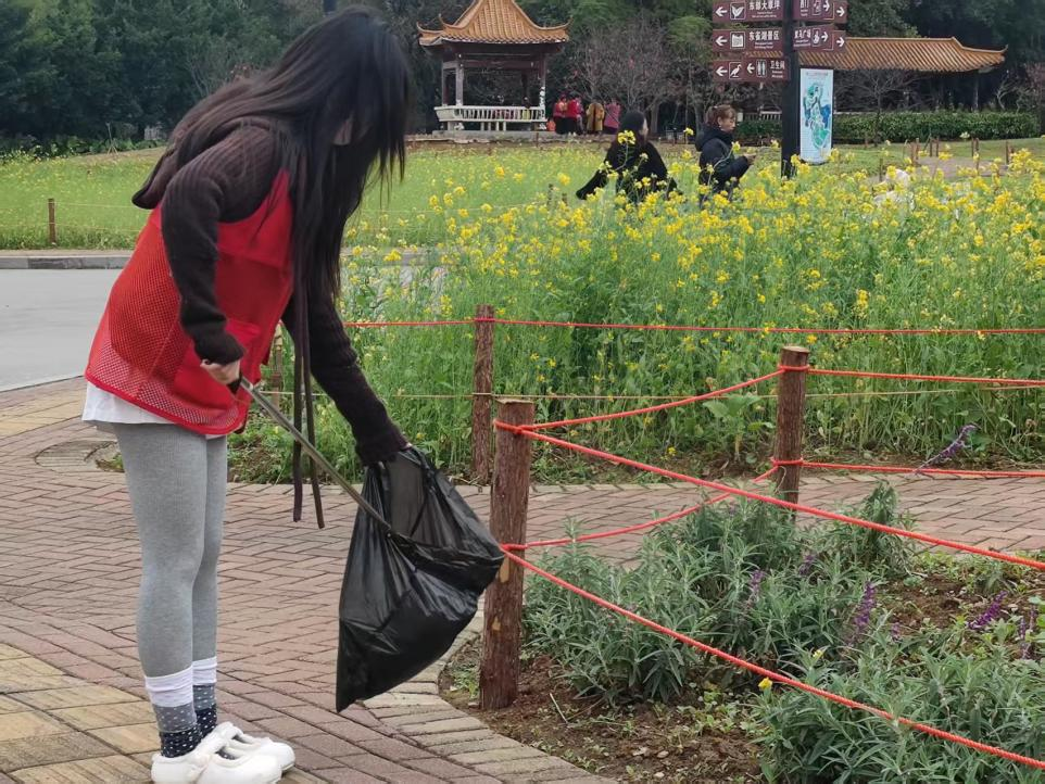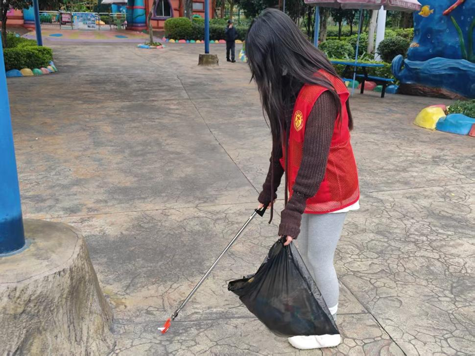 活动伊始,志愿者们在雀儿山公园入口集合,明确分工与清洁区域后,便携带垃圾夹、垃圾袋等工具迅速投入工作。志愿者们兵分多路,对公园主干道、草坪花丛、儿童游乐区及凉亭周边等重点区域进行细致清理。过程中,志愿者们相互协作,不放过任何一处卫生死角,以实际行动维护公园的干净整洁。不少游客看到志愿者们的行动后,也主动将手中的垃圾扔进垃圾桶,有的游客还对志愿者们的行为点赞。