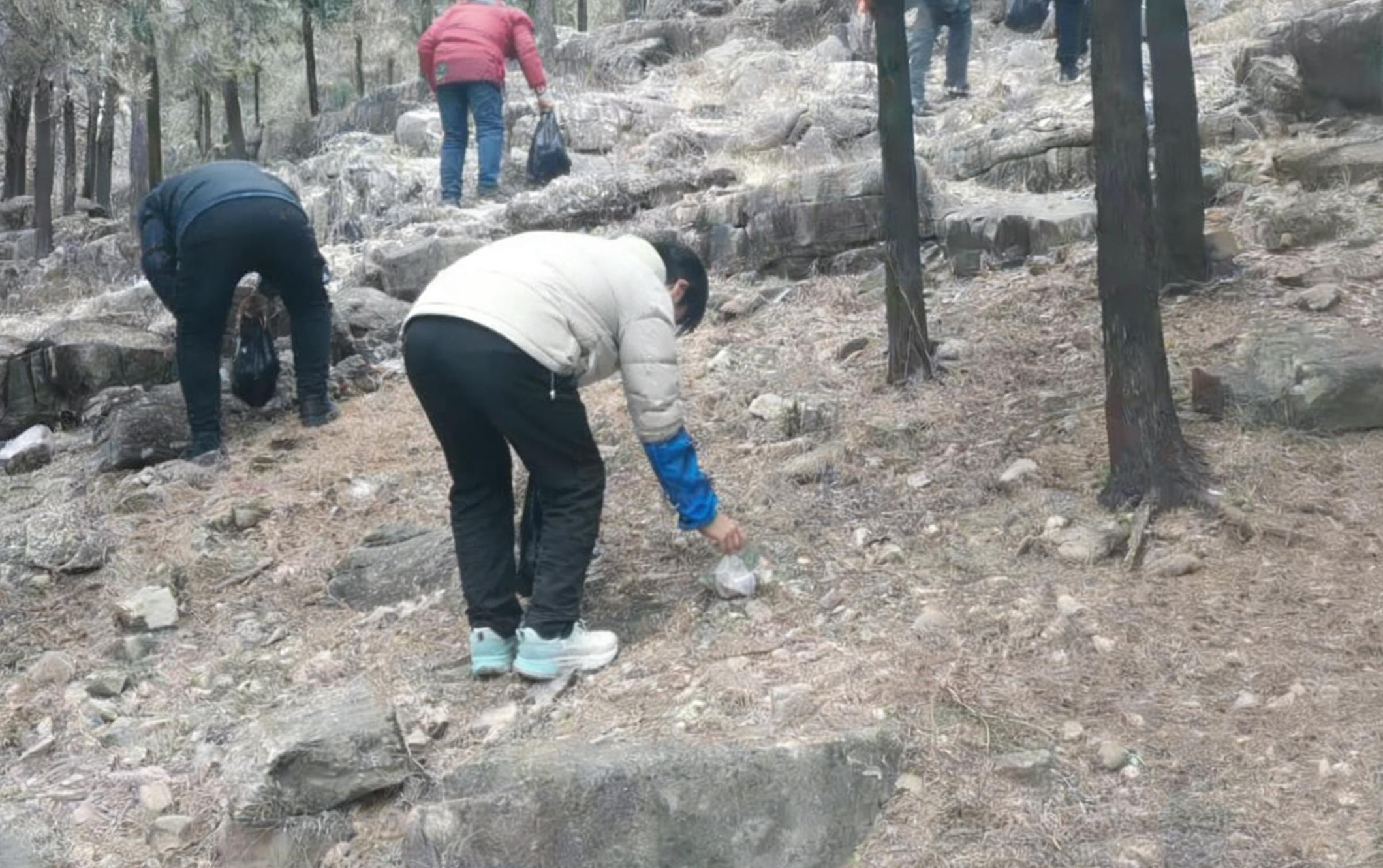 活动开始前,带队工作人员向志愿者简要介绍了钟罗山的冬季生态特点及山地环境保护的注意事项。随后,志愿者不畏严寒,手持垃圾袋,沿山道、坡地及林木间展开地毯式清理。志愿者细致捡拾被落叶半掩、散落在冻土与石缝间的塑料制品、烟蒂、废弃包装等垃圾,并进行分类归集。寒风中没有削减大家的干劲,反而更显团结协作、吃苦耐劳的精神风貌。经过数小时的努力,多处卫生死角得到清理,山体环境更为整洁。