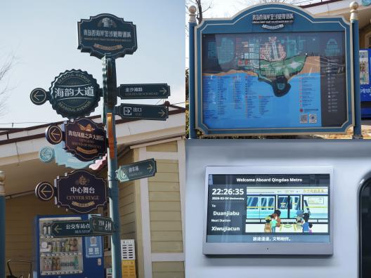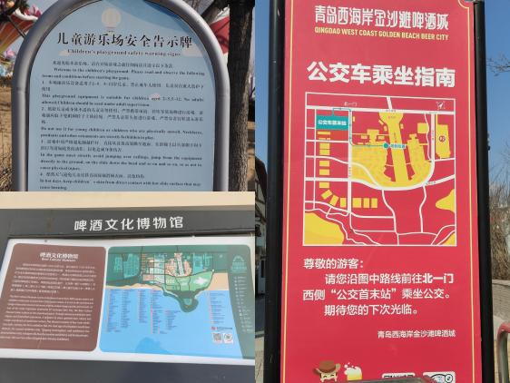 团队马不停蹄,在前湾港集装箱仓库采集物流标识、港口作业区内的双语或多语设置情况,在洋溢着节日氛围的西海岸金沙滩啤酒城,对大型节庆活动场所的公共指示牌和商业广告用语进行了整理。在市区一线,团队走访了中国人民解放军海军博物馆和海军公园。在这些文博展馆与公共休闲空间,队员们仔细审视了展陈说明、导览图等各类标识的信息呈现方式,并逐一进行记录。