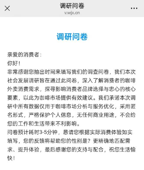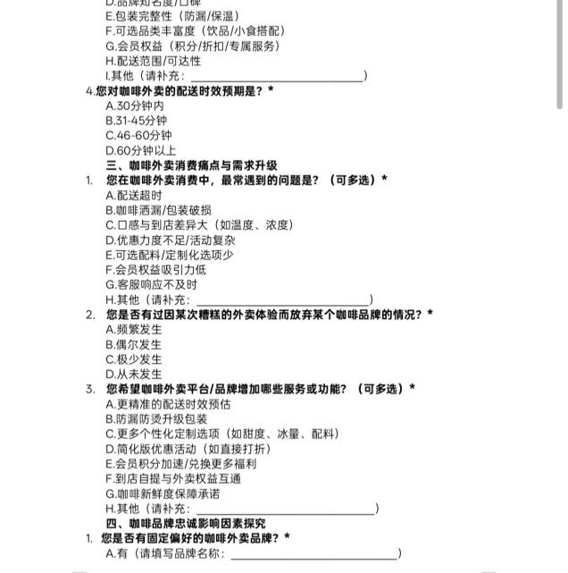 在整个活动的推进过程中,实践团队紧紧围绕“咖啡外卖消费需求与品牌忠诚度”这一核心主题开展工作。为全面且深入地了解相关情况,团队精心设计了一份线上调研问卷,问卷涵盖多个重要维度:个人背景信息,如性别、年龄、职业等基本情况;消费行为,如购买频率、消费时间段等;消费痛点,即消费者在咖啡外卖消费过程中遇到的各类难题与不便之处;以及品牌偏好,即消费者对不同咖啡品牌的喜好倾向等。