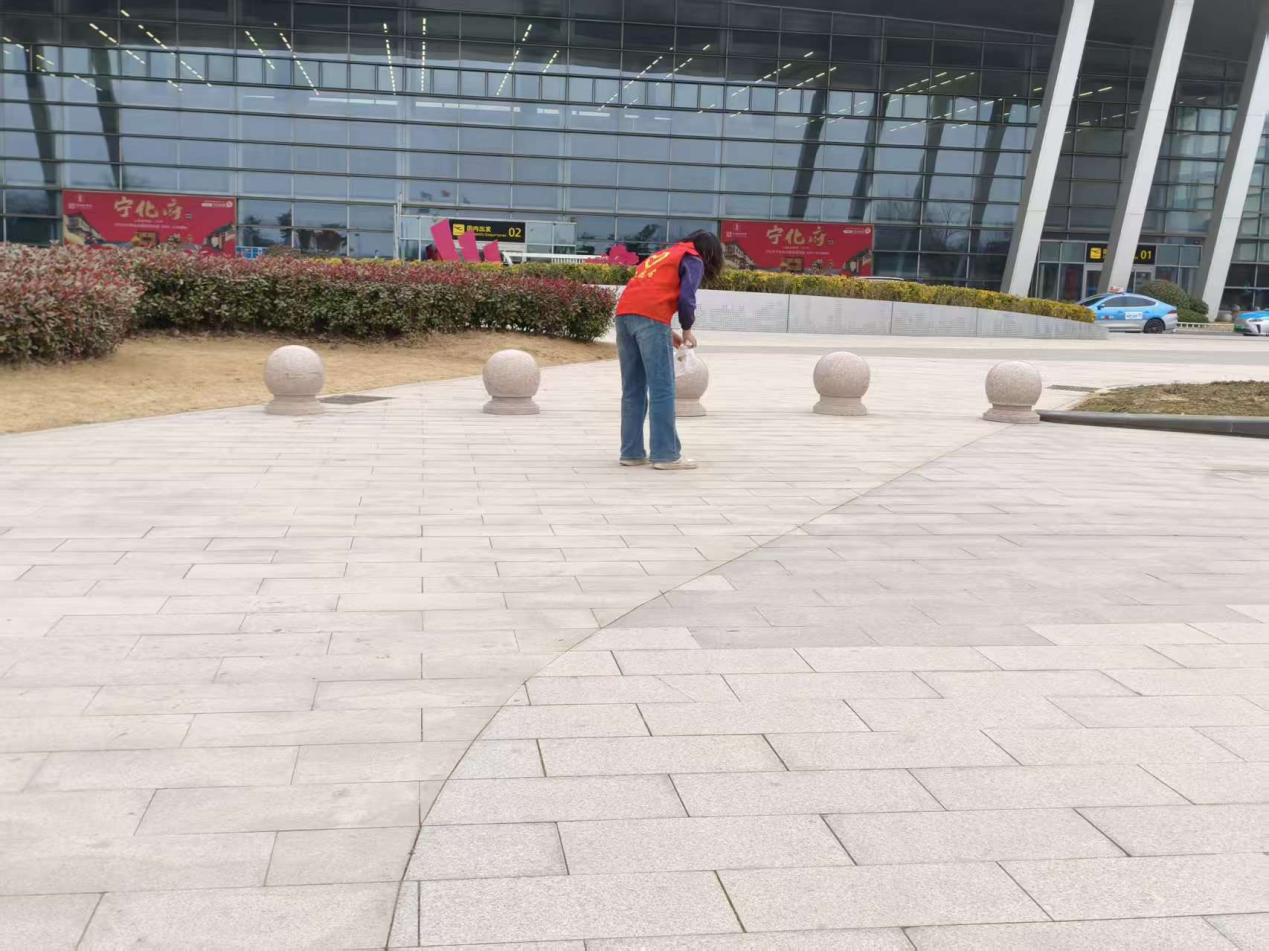 活动过程中,志愿者身着统一红色志愿马甲,携带扫帚、垃圾袋等清洁工具,在机场站前广场及周边公共区域有序开展清扫工作。志愿者分工协作,重点对地面烟蒂、纸屑、饮料瓶等杂物进行捡拾,深入绿化带清理隐藏的零食包装袋等垃圾;随后,志愿者对广场步道、垃圾桶周边、车辆通行辅路等区域进行全面清扫,确保不留卫生死角;此外,志愿者还对机场公共设施进行擦拭清洁,祛除表面污渍,还原设施整洁面貌。清扫过程中,志愿者认真细致、配合默契,展现出良好的团队协作精神与服务意识。