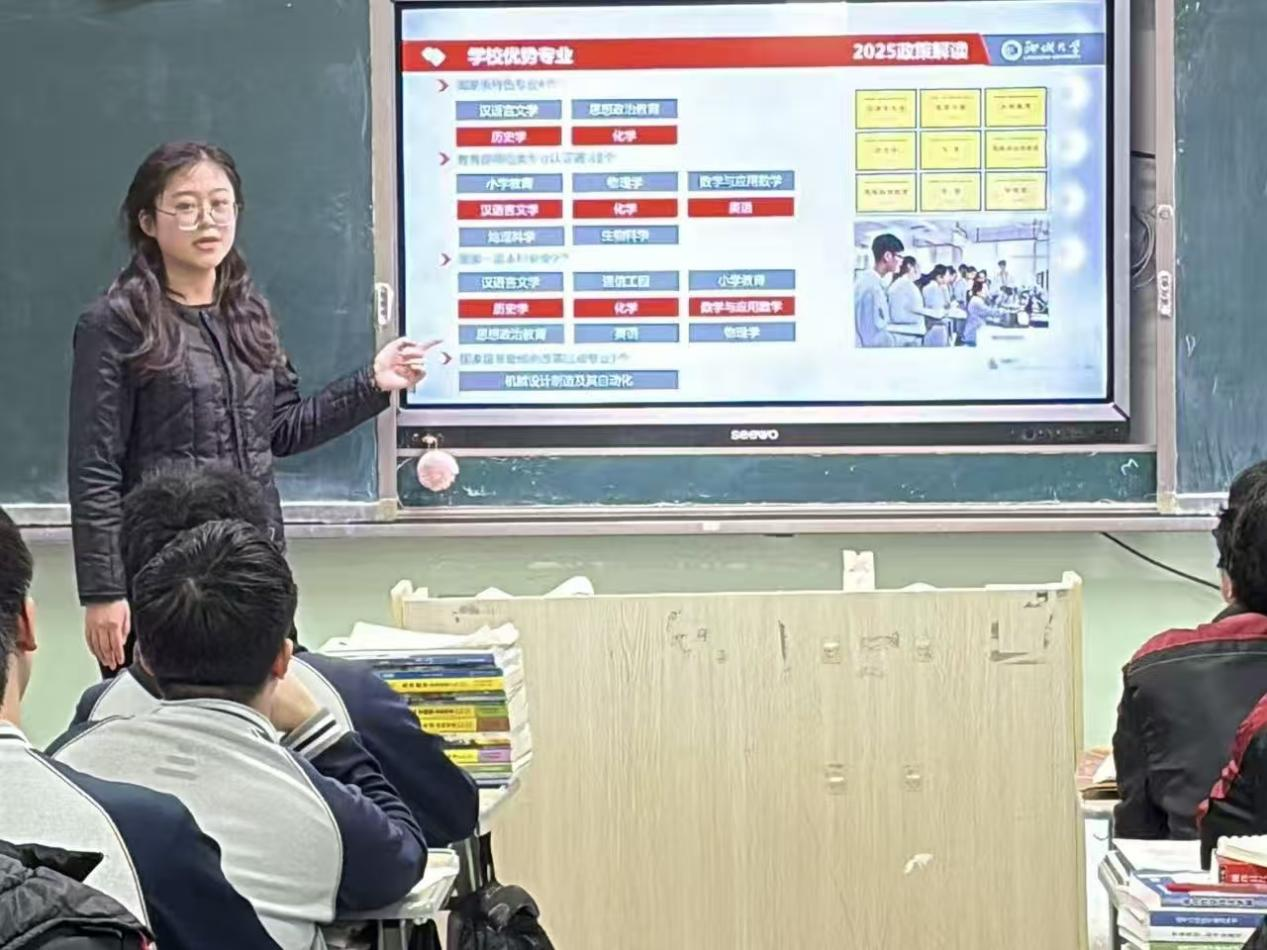 活动伊始,侯文佳教师对实践队的到来表示热烈欢迎,并简要介绍了高三26班学生的学习情况与备考状态。随后,刘天心围绕“科学备考·逐梦前行”的主题展开宣讲,结合自身在聊城大学外国语学院的学习经历与高考备考心得,从学科复习策略、时间管理技巧、心态调整方法等方面进行分享。宣讲过程中,刘天心着重介绍了聊城大学的办学特色、学科优势及人才培养成果,详细解读了外国语学院的专业设置、师资力量、课程体系与就业前景等,让学生对聊城大学有了更全面、深入的了解。互动环节中,学生踊跃提问,内容涉及志愿填报、专业选择、大学生活等方面,刘天心逐一耐心解答,现场氛围热烈。