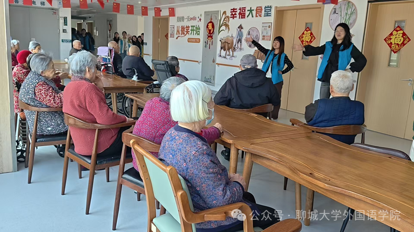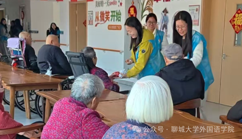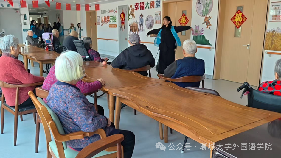 为传承中华民族敬老爱老传统美德,丰富颐养中心老人精神文化生活,3月21日,外国语学院23名志愿者赴聊城市馨泰颐养中心开展“伴老尊老,笑容无限”敬老爱老主题活动。活动由外国语学院志愿者统筹筹备,2410班、2404班、2501班等多个班级学生积极参与,以文艺表演与互动游戏为核心形式,为老人们传递温暖与欢乐。