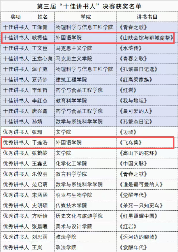 外国语学院学子在聊城大学第三届“校园十佳讲书人”决赛中获得佳绩,耿振佳荣获“校园十佳讲书人”称号,于连浩荣获“优秀讲书人”称号,充分展现了外国语学院学子的风采。