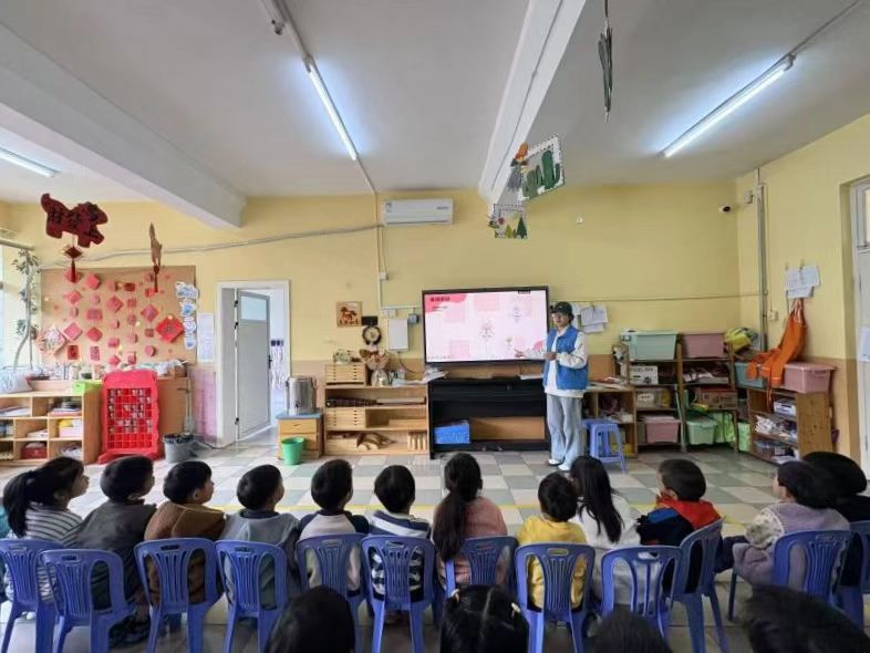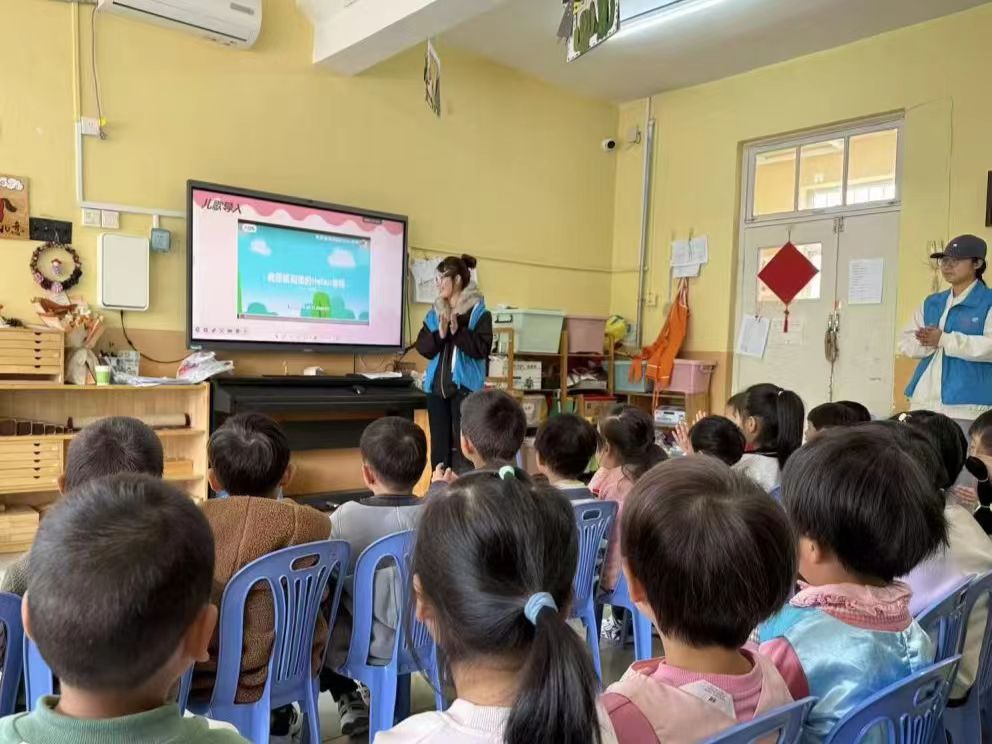 活动伊始,志愿者以经典英文儿歌激发幼儿英语学习兴趣;随后围绕踏青、野餐主题开展“单词寻宝”“情景模仿”等趣味游戏,引导孩子们在玩乐中认读、表达,轻松掌握食物、自然、动作等相关词汇。野餐环节,志愿者引导幼儿用英文交流食物名称、分享感受,将课堂所学与实际场景结合,巩固学习成果,让孩子们在真实语境中感受英语的实用价值。
