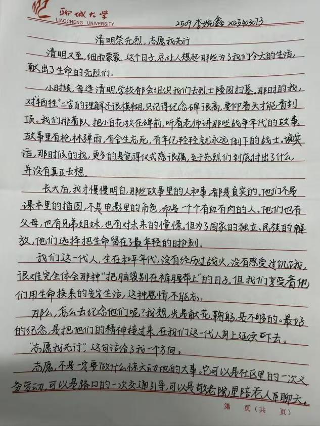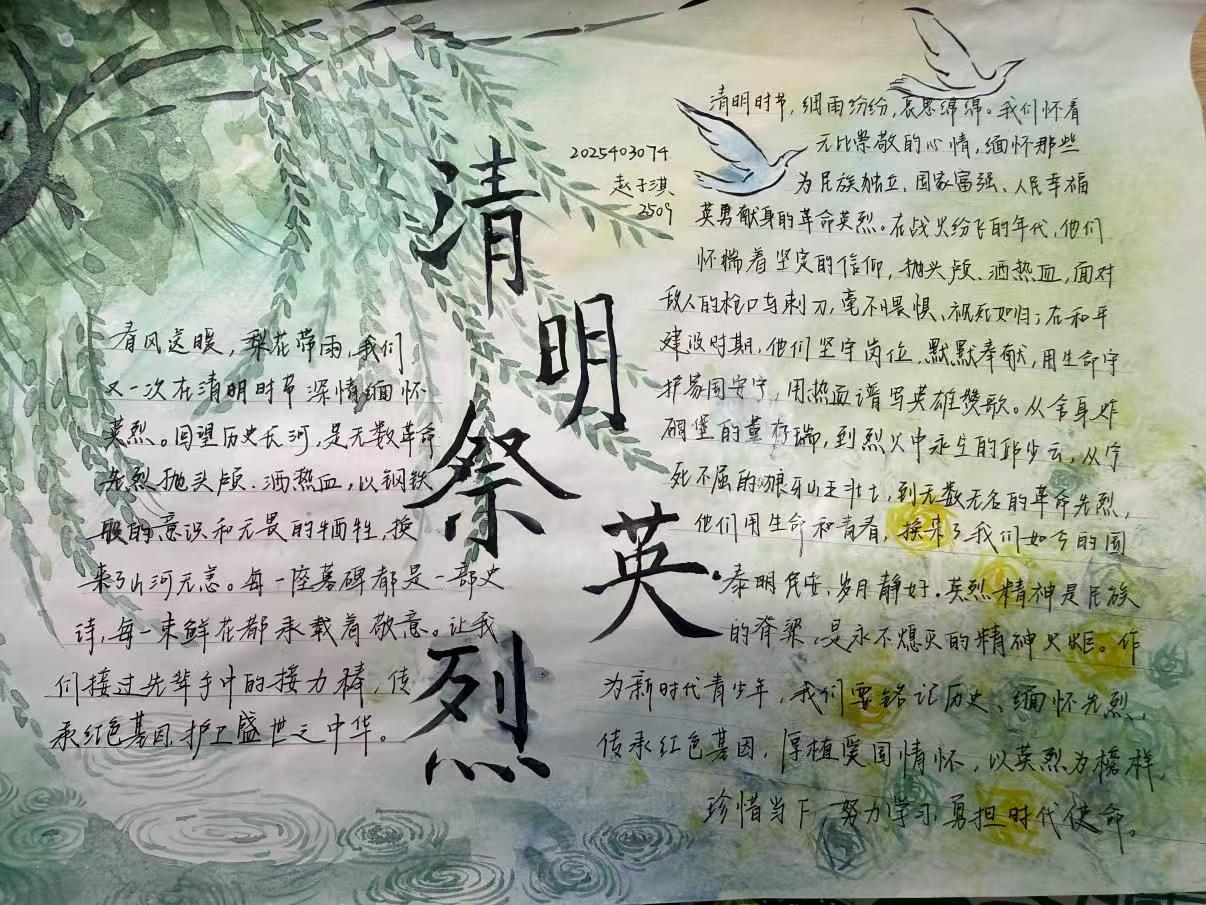 本次活动以清明节为契机,面向外国语学院全体学生开展手抄报与主题征文征集。活动鼓励同学们结合志愿精神抒发节日感悟,以笔墨丹青传承“慎终追远”的优良传统。 活动前期,学院通过公众号、班级群发布通知,明确作品要求、提交时间及格式,并建立QQ群及时答疑、跟进进度,保障活动顺利开展。活动期间,学生完成创作后按规范格式提交作品,工作人员及时核验、分类登记,确保征集工作有序推进。
