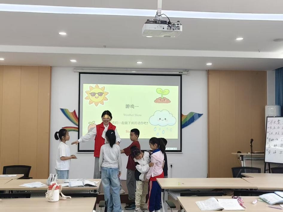 活动伊始,志愿者以谷雨节气为切入点,结合趣味图片向学生讲解节气由来与相关习俗,引导学生学习 “rain”“sun”“seed” 等与天气、植物生长相关的英语单词,并通过领读、问答互动等方式,帮助学生巩固发音与词义。随后,教师带领学生开展 “Weather Show” 互动游戏,通过动作模仿、情景演绎的形式,让学生在轻松氛围中复习旧单词、运用新词汇,加深对英语单词的理解与记忆。课堂上,学生积极参与互动,主动举手回答问题,现场氛围热烈有序。活动全程,志愿服务队成员分工协作,保障活动顺利推进。