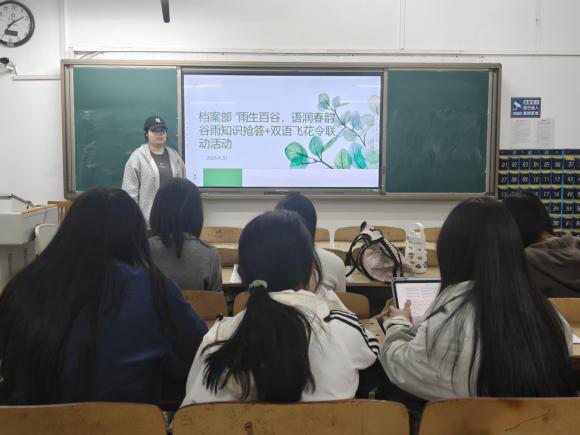 为传承中华优秀传统文化,创新节气文化体验形式,4月20日,外国语学院秘书处档案工作部于西1#A504教室举办谷雨节气特色文化活动。本次活动以“雨生百谷,语润春韵”为主题,融合知识抢答与双语飞花令两大核心板块,吸引了众多学生踊跃参与。