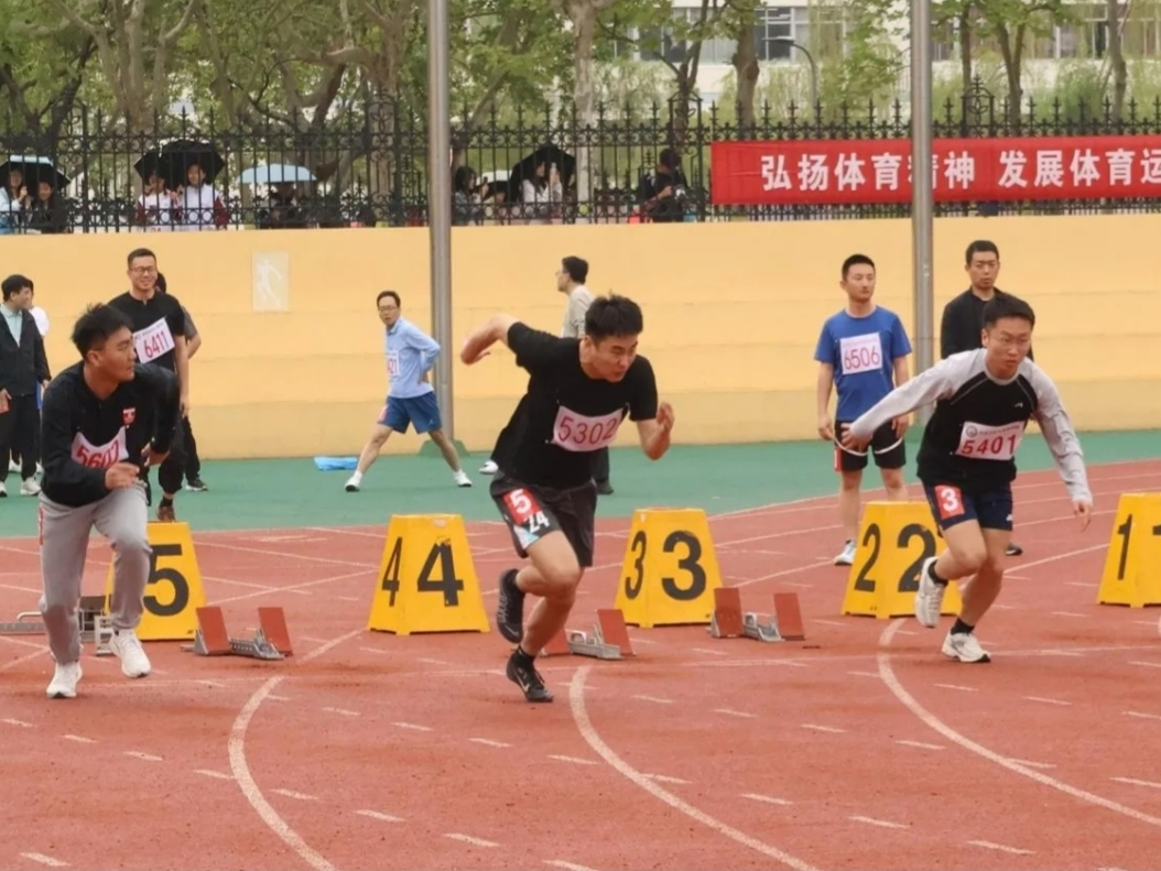 发令枪响,运动员如离弦之箭冲出起跑线。起跑迅猛,途中跑节奏稳健,最后时刻奋力压线,红色的跑道见证了对速度极限的追逐。最终,刘新成老师勇夺男子100米第一名。