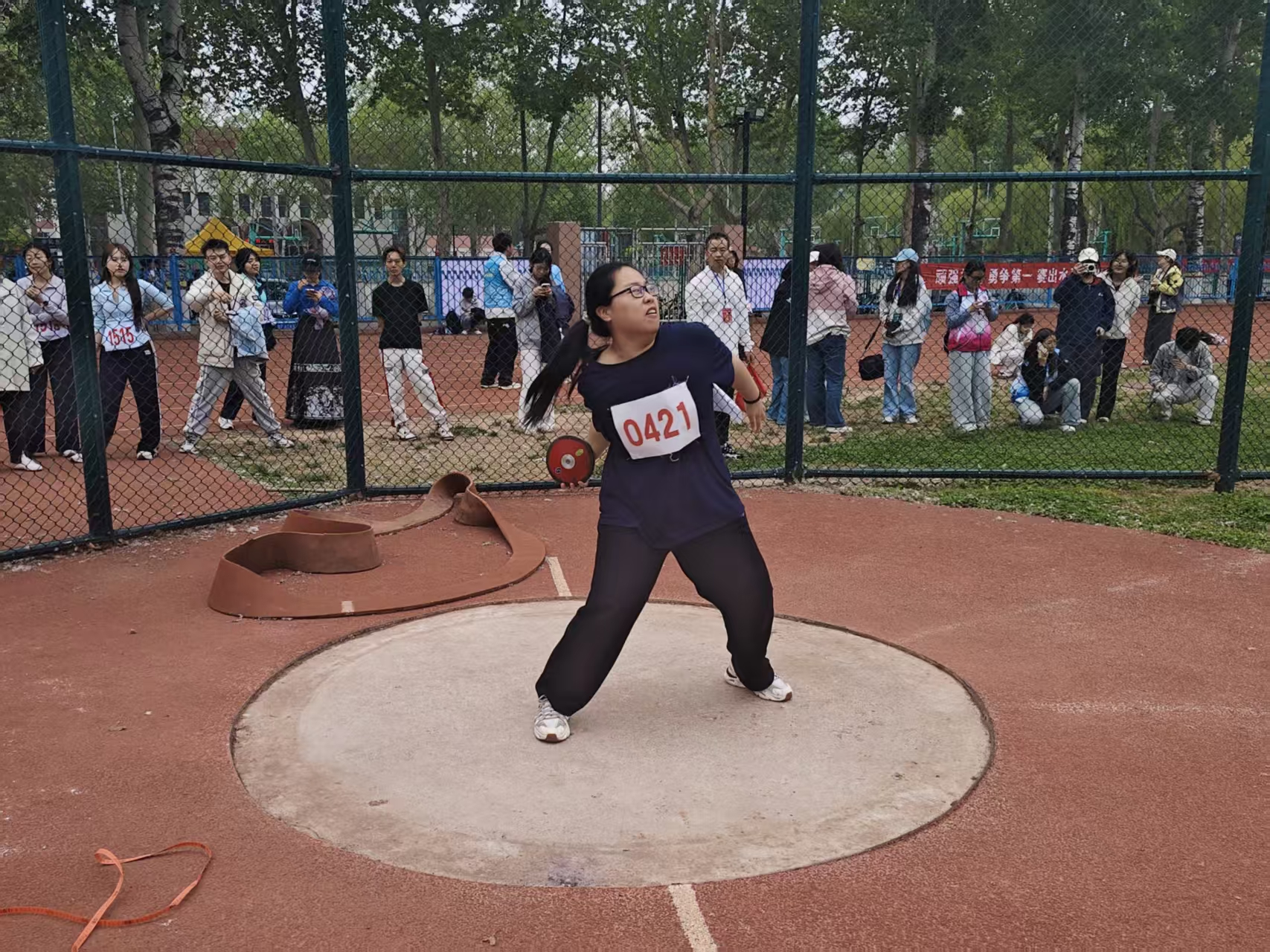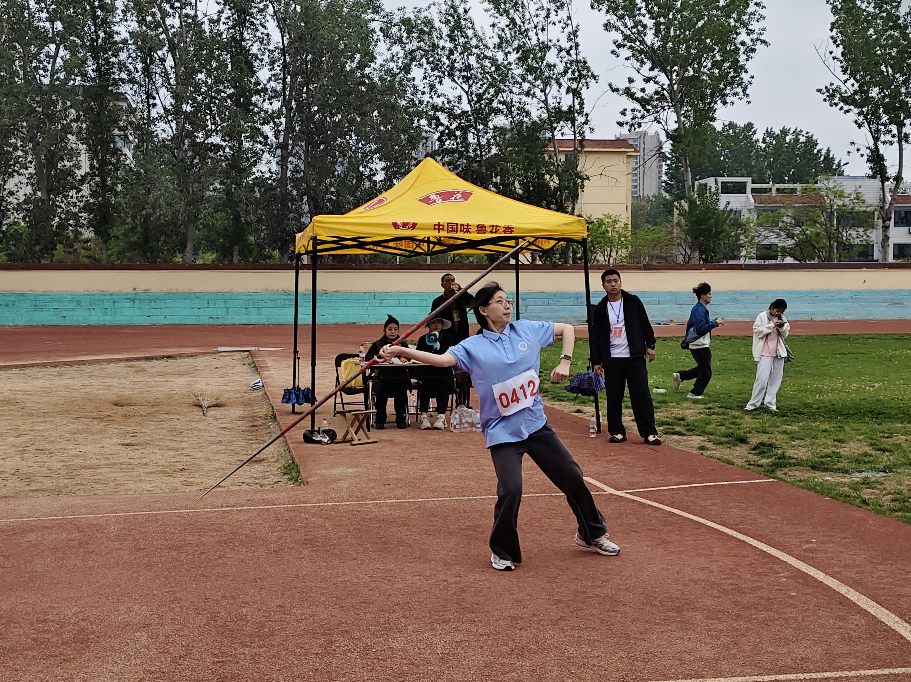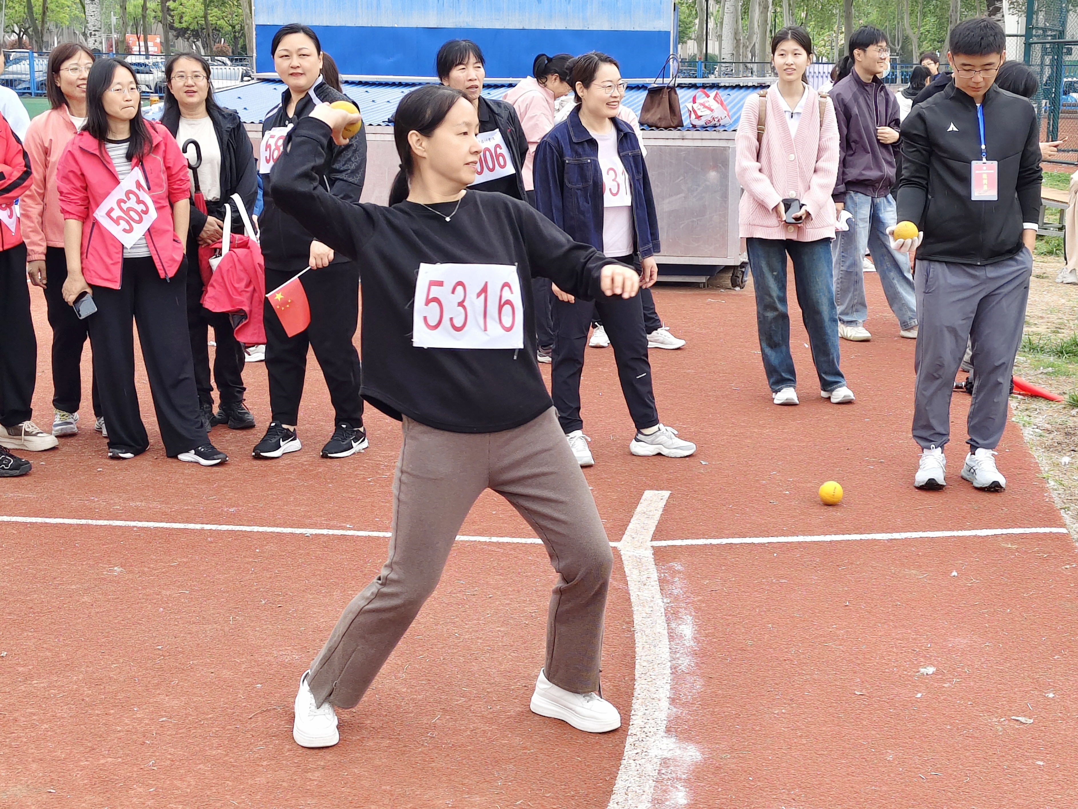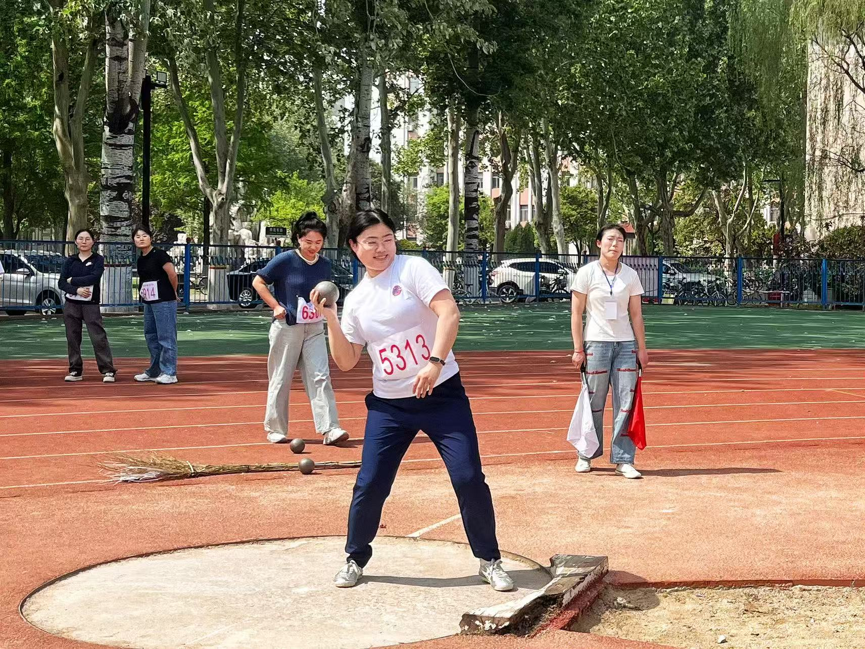 沉甸甸的铅球紧贴颈侧,滑步、转体、挺胸、推球,动作连贯流畅。铅球在空中划出有力的弧线,力量与技巧在此刻完美结合。最终,杨璐老师获得铅球第三名。