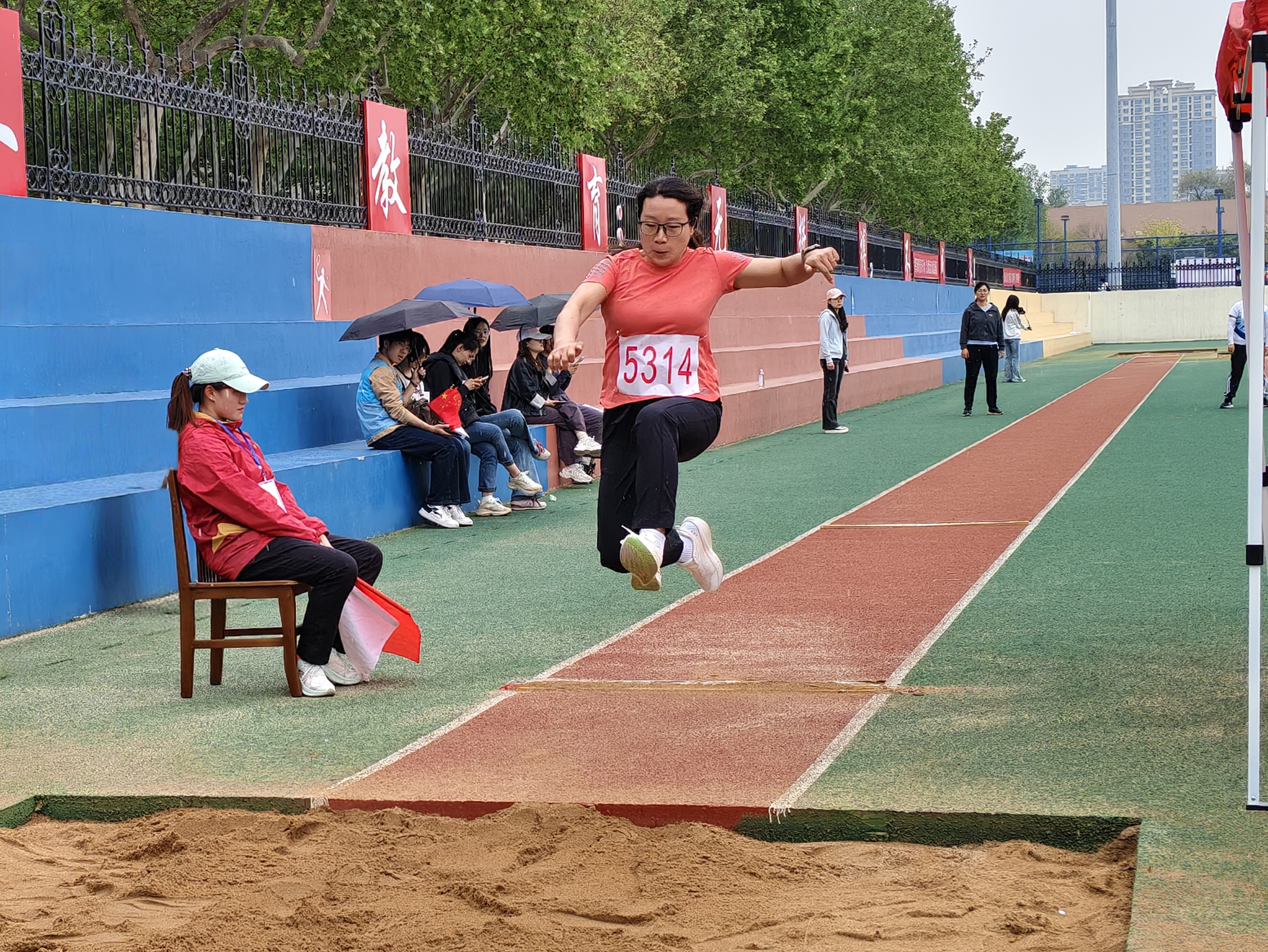 助跑如风,踏跳有力,腾空舒展,落地稳健。一次次丈量步点、调整节奏,纵身一跃间在沙坑中留下深深的印记。最终,王志霞老师荣获跳远第二名。