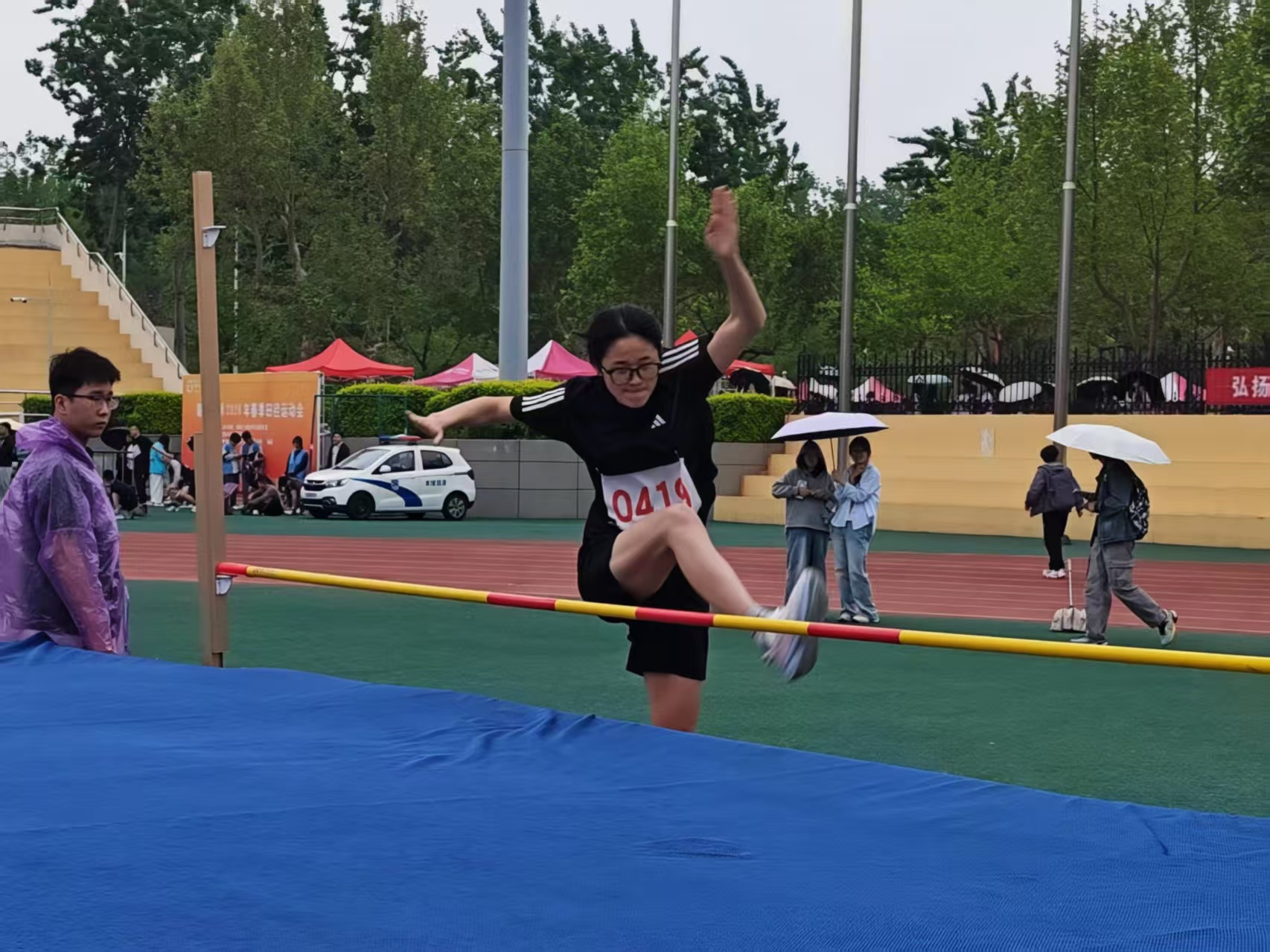 助跑如风,起跳腾空,背越式过杆。面对不断升高的横杆,一次次发起挑战,即使三次试跳失败也毫不气馁,用行动诠释了永不言弃的体育精神。最终,纪文平荣获跳高第三名。