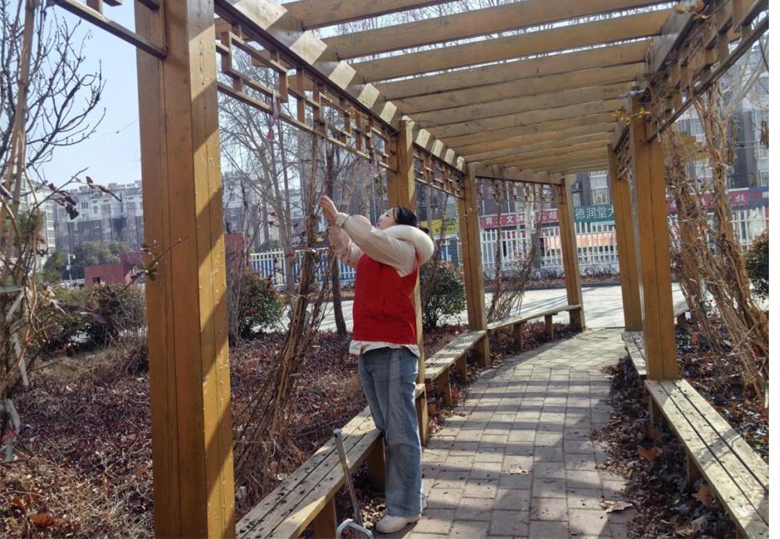 活动中,实践队员在社区工作人员的协调与引导下,有条不紊地分组,投身于各项具体服务工作中。部分队员专注于绿植养护,对社区内部分枯萎、杂乱的植被进行修剪、补种与浇灌,竭力恢复公共绿地的生机与美观。其余队员手持清洁工具,仔细清扫道路及绿化带内的积存落叶与杂物,并对社区公共区域的乒乓球台等健身设施进行彻底擦拭与消毒,确保居民能够安全、舒适地使用。整个过程虽烦琐辛劳,但队员们始终保持认真负责的态度,以实际行动改善了社区人居环境,赢得了过往居民的驻足赞赏与肯定。